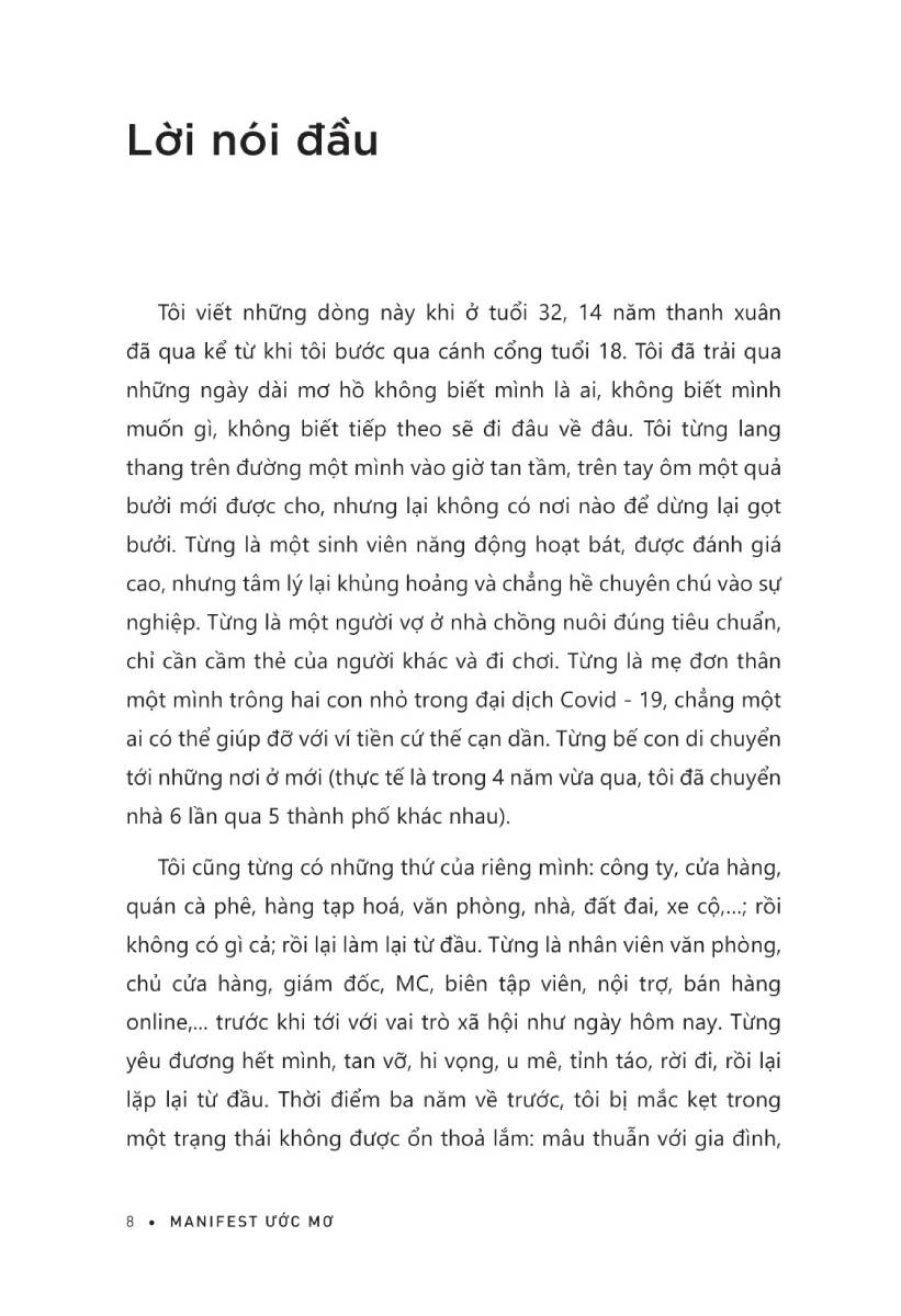 Manifest Ước Mơ - Biến Mọi Khát Khao Thành Hiện Thực Đây là một cuốn sách nói về ước mơ. Bạn có ước mơ nào không? Rất nhiều người sẽ ngay lập tức không do dự mà trả lời là “Có”. Luôn có những ước mơ được vun đắp từ thuở nhỏ, cũng có những ước mơ được hình thành trong quá trình lớn lên của một người. Nhưng không phải ai cũng có may mắn xác định được đúng ước mơ của mình, hoặc hiểu rõ về bản chất của ước mơ và cách ứng dụng các quy luật của vũ trụ để hỗ trợ hành trình đạt được ước mơ đó. Tác giả Hằng Nga Phạm cũng thế. Cô từng trải qua rất nhiều thăng trầm trong sự nghiệp, tình yêu và cuộc sống nói chung để đạt được điều cô khao khát nhất ở thời điểm hiện tại: sự tự do đích thực. Tự do tài chính, tự do trong mọi quyết định, tự do sống theo ý muốn. “Cuốn sách này có tất cả những gì tôi đã học, đã đọc, đã nghiệm lý, đi kèm với tất cả những kinh nghiệm tôi đã trải qua về Manifest ước mơ. Tôi ước gì tôi đã đọc được một cuốn sách tương tự như thế này khi mới ở ngưỡng cửa cuộc đời. Tôi không thể quay ngược thời gian, nhưng có rất nhiều bạn trẻ đang háo hức bắt tay vào thực hiện ước mơ. Tôi viết cuốn sách này cho các bạn. Tôi cũng viết cuốn sách này cho những ai đang muốn định hình lại cuộc sống từ đầu và có một cuộc sống hạnh phúc hơn.”