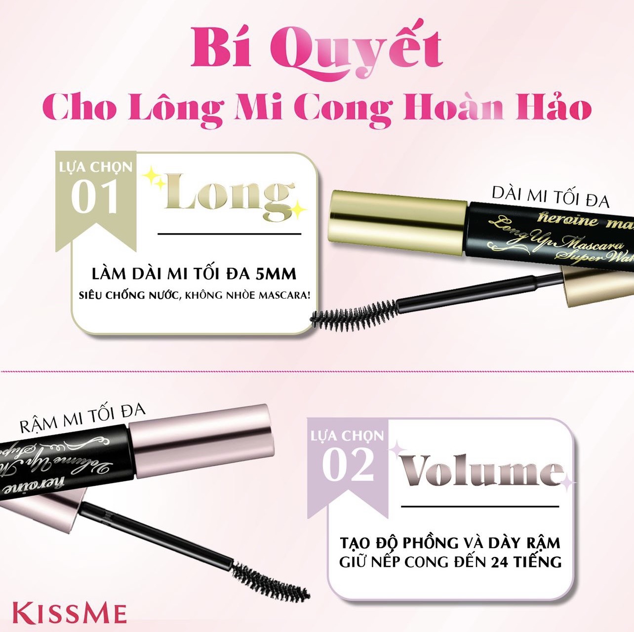 Mascara Kissme Heroine Make Long Up Mascara Super   Giúp Nâng Cong Và Dài Mi Tối Đa Chống Trôi Siêu Bền 6g Thông tin sản phẩm: Số Lô: In trên sản phẩm Xuất Xứ: Nhật