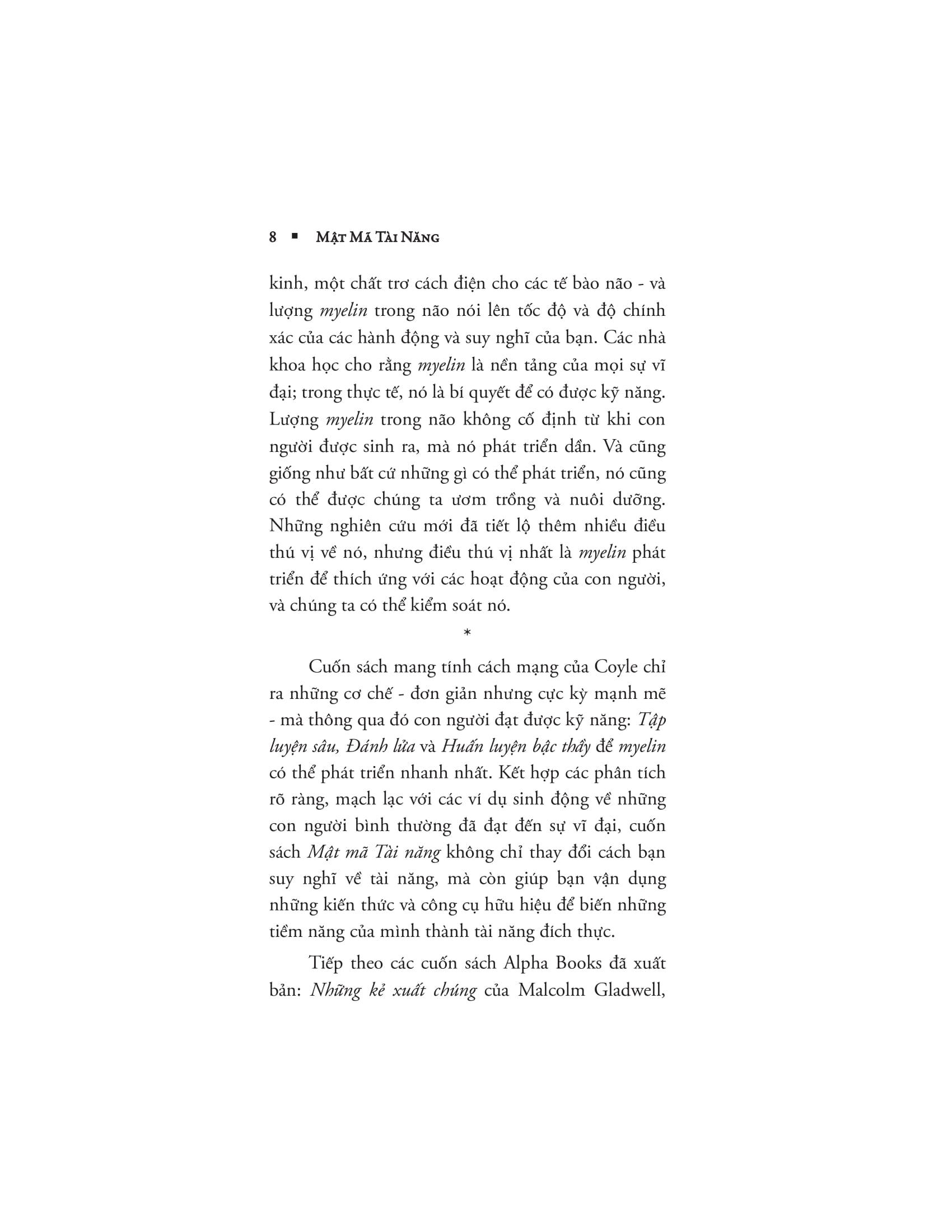 Dù bạn đang huấn luyện cho một đội bòng bầu dục hay dạy một đứa trẻ chơi đàn piano, viết tiểu thuyết hay cố gắng cải thiện cú vung gậy trong môn bóng chày thì cuốn sách mang tính cách mạng này sẽ chỉ cho bạn biết cách nuôi dưỡng và phát triển tài năng thông qua việc khai thác và sử dụng một cơ chế mới được khám phá của não bộ.