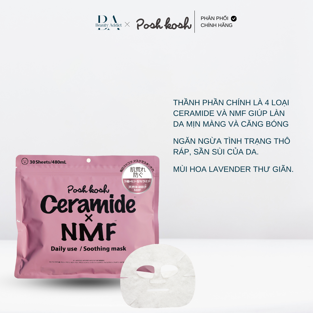Chỉ với 3 phút đơn giản mỗi ngày thêm vào chu trình dưỡng da, bạn sẽ thấy làn da của bạn sẽ thay đổi rõ rệt!Mặt nạ Posh Kosh 30 miếng sẽ giúp làn da của bạn được cải thiện tốt lên từng ngày, một túi mặt nạ chứ 480ml tinh chất dưỡng tương đương mỗi miếng mặt nạ là 16ml tinh chất đậm đặc bổ sung cho làn da của bạn! POSH KOSH SO MASK với 2 thành phần chính là 4 loại Ceramides và NMF giúp làm mịn da, ngăn ngừa tình trạng khô ráp và tăng cường hàng rào bảo vệ da. Các thành phần nổi bật khác như: ·      Ceramide NG, Ceramide NP, Ceramide AP: Là một trong 9 loại Ceramides có thể được tìm thấy tự nhiên ở lớp trên của da và đóng một vai trò cực kỳ quan trọng trong việc hình thành hàng rào bảo vệ da khỏe mạnh và giữ cho da ngậm nước. ·      Ceramide từ thực vật ( chiết xuất từ quýt Nhật): bổ sung độ ẩm và ngăn ngừa mất ẩm, làm cho da mềm mại, mịn màng và khỏe mạnh ·      Sodium hyaluronate crosspolymer-2 : Hoạt chất góp phần dưỡng da ẩm chuyên sâu, phục hồi da khô sạm, hỗ trợ cân bằng ẩm và ngăn ngừa lão hóa. ·      NMF : giúp cải thiện vẻ bề ngoài của làn da, cho da trông trẻ trung, đầy đặn và tràn đầy sức sống. ·      Sản phẩm có hương lavender thư giãn.   Mặt nạt Posh Kosh kết hợp giữa 2 hợp chất giúp hỗ trợ và tăng gấp đôi hiệu quả trên da, giúp bạn tiết kiệm thời gian hơn. HDSD:  ·      Sau khi làm sạch da mặt, lau sơ da với lotion hoặc dưỡng ẩm bằng xịt khoáng và sau đó đắp mặt nạ lên da, điều chỉnh vị trí cho phù hợp với khuôn mặt của bạn. ·      Để mặt nạ trên da từ 3-5 phút, sau đó tháo ra và gấp gọn, thoa mặt nạ đã gói gọn theo vòng tròn hướng từ trong ra ngoài trên mặt và vùng cổ. ·      Vỗ nhẹ cho tinh chất thấm đều trên da, tiếp tục thực hiện các bước dưỡng da sau đó. ·      Không cần rửa lại với nước sau khi đắp mặt nạ.