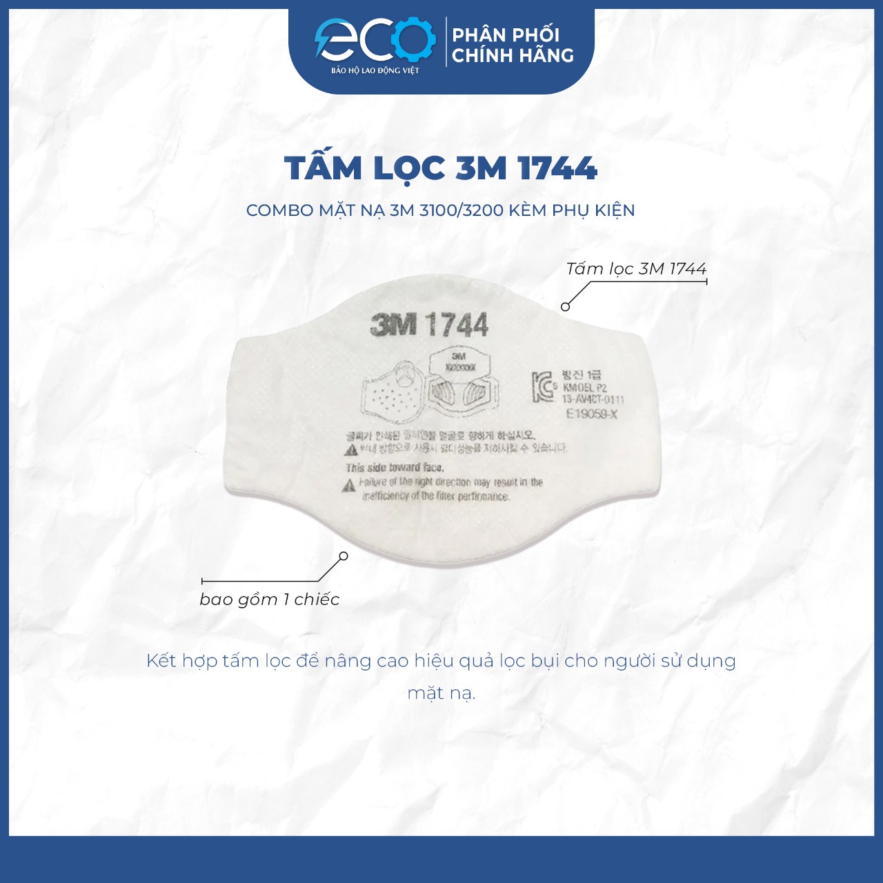 - Quy Cách Đóng Gói: 1 Cái (không phin lọc) Tấm lọc 3M 1744 Tấm lọc bụi 3M 1744 giúp lọc sạch các loại bụi, khói hàn, hơi hữu cơ hiệu quả, được làm bằng sợi không dệt, màng lọc tĩnh điện, có khả năng lọc được các hạt bụi có kích cỡ từ 0,3µm. Khi làm việc trong môi trường có chứa nhiều bụi bẩn, công nhân cần được trang bị một chiếc mặt nạ để bảo vệ hô hấp. Mặt nạ cần được sử dụng kết hợp với phin lọc và tấm lọc để tăng hiệu quả lọc bụi. ️ Thông tin sản phẩm Tấm lọc bụi 3M 1744