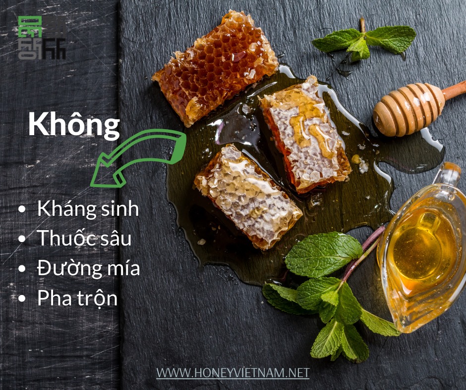 - 100% mật ong tự nhiên không bị pha đường hoặc siro đường. 3 KHÔNG: đường mía, tồn dư kháng sinh, tồn dư thuốc sâu trong quá trình nuôi ong. Nguồn mật đảm bảo, không pha trộn với các loại mật thấp tiền khác.