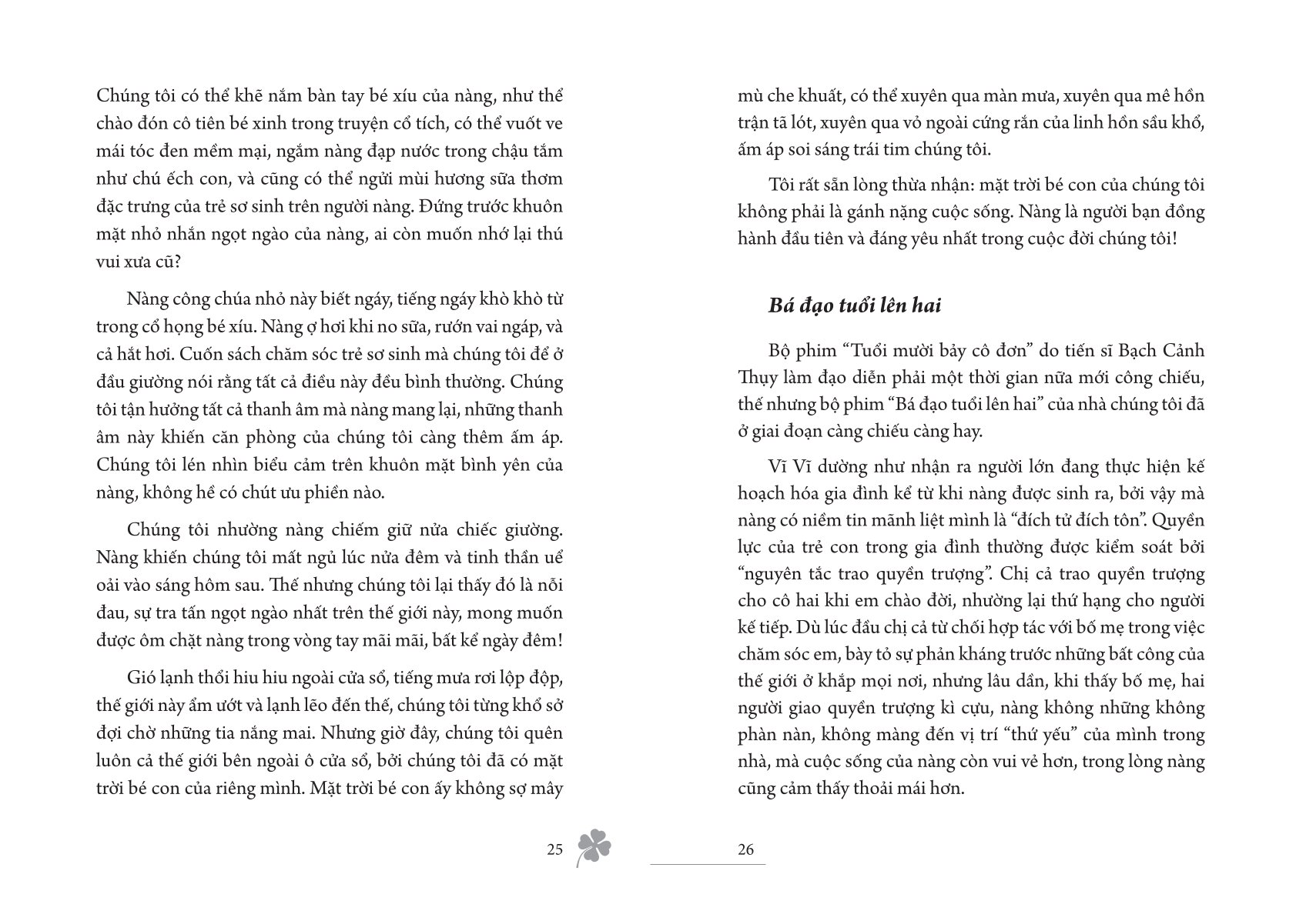 Mặt trời bé con là tập tản văn nhẹ nhàng mà giàu xúc cảm về gia đình, vừa kể, vừa chiêm nghiệm dưới góc nhìn của nhân vật “tôi” – người chồng học cách chung