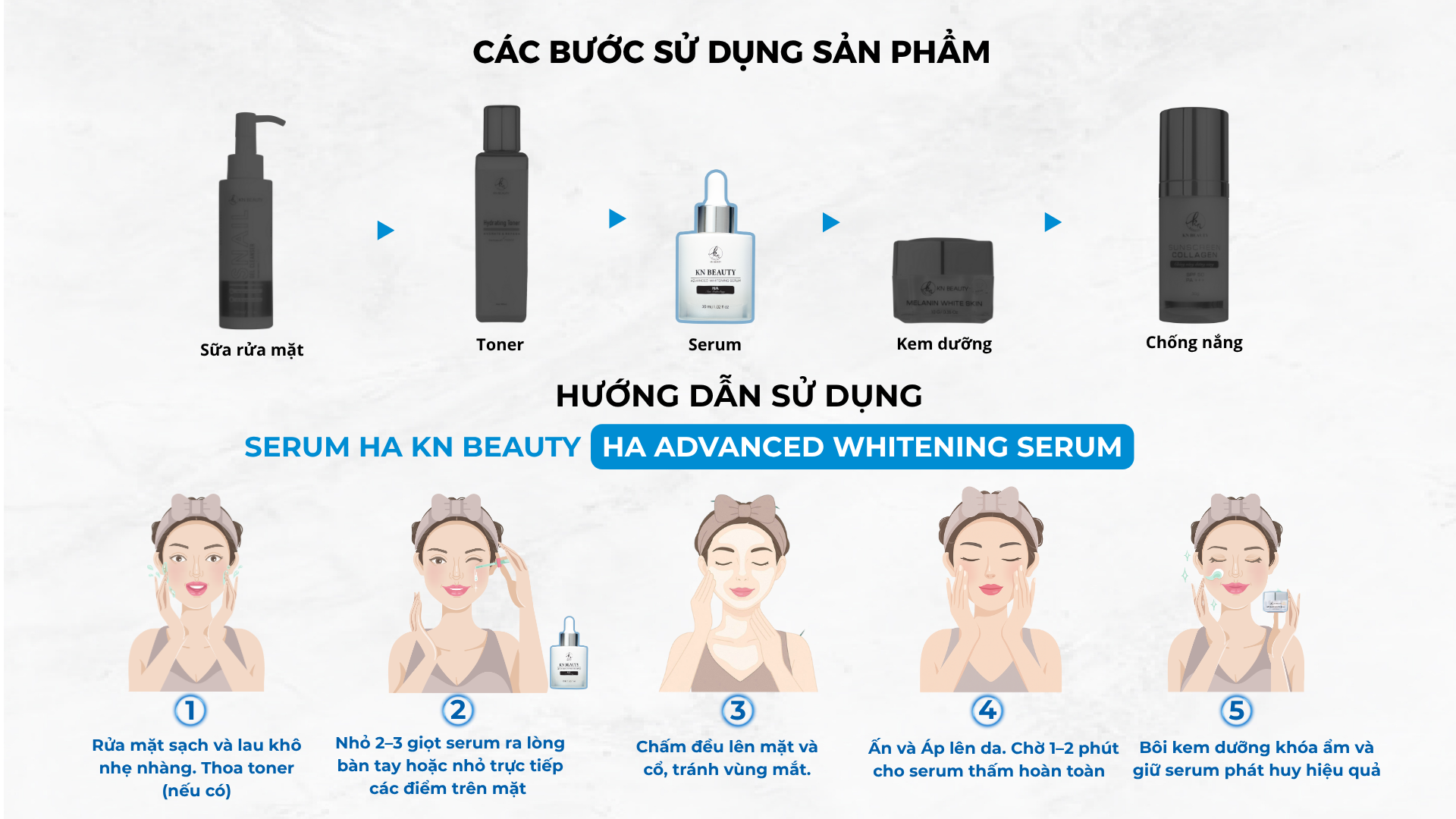 Serum Dưỡng Da KN Beauty Advanced Whitening 30ML    CÔNG DỤNG:     Serum chứa nhiều dưỡng chất và vitamin ở dạng phân tử siêu nhỏ, thấm nhanh giúp da hấp thụ da. · Dưỡng chất dưỡng sáng da. · Cải thiện và làm m /ò? các vết nám. · Cải thiện các dấu hiệu của lão hóa da. · Dưỡng ẩm mang lại làn da mềm mại mịn màng HƯỚNG DẪN SỬ DỤNG  Sử dụng ngày 1 -2 lần. Sử dụng kết hợp với kem face của KN BEAUTY để đạt kết quả tối ưu Dùng vào ban ngày và ban đêm.  THÔNG TIN THƯƠNG HIỆU: KN Beauty là thương hiệu mỹ phẩm cao cấp chuyên các dòng dưỡng trắng da mặt, dưỡng trắng toàn thân. Được các nghệ sĩ yêu thích nhất hiện nay và là sản phẩm đạt top 10 thương hiệu Châu Á Thái Bình Dương.   HSD: 3 năm kể từ ngày sản xuất NSX: In trên bao bì sản phẩm
