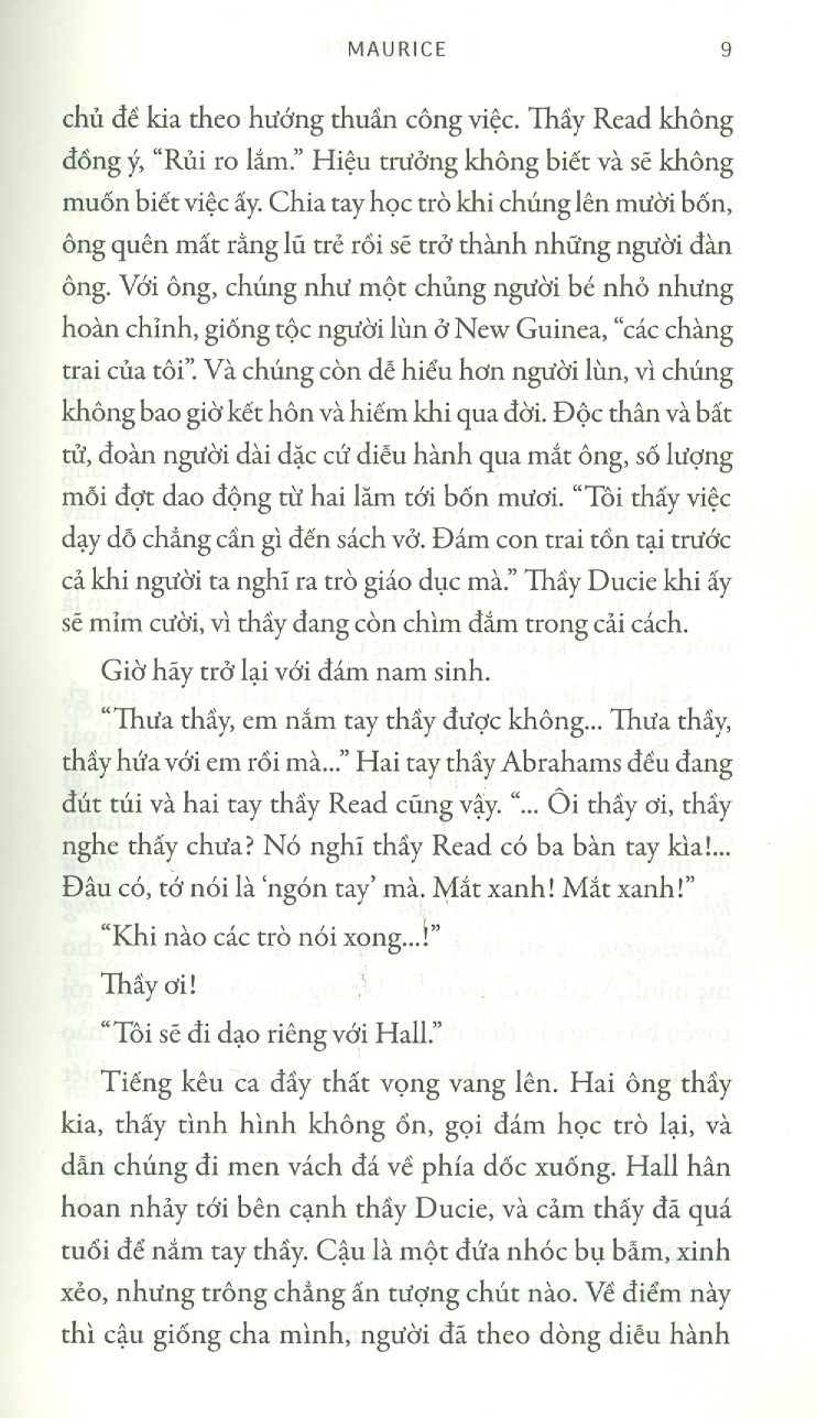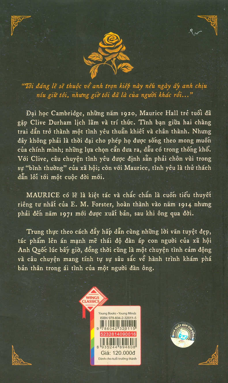 “Tôi đáng lẽ sẽ thuộc về anh trọn kiếp này nếu ngày ấy anh chịu níu giữ tôi, nhưng giờ tôi đã là của người khác rồ” Đại học Cambridge, những năm 1920, Maurice Hall trẻ tuổi đã gặp Clive Durham lịch lãm và trí thức. Tình bạn giữa hai chàng trai dần trở thành một tình yêu thuần khiết và chân thành. Nhưng đây không phải là thời đại cho phép họ được sống theo mong muốn của chính mình; những lựa chọn cần đưa ra, dẫu có trong thống khổ. Với Clive, câu chuyện tình yêu được định sẵn phải chôn vùi trong sự “bình thường” của xã hội; còn với Maurice, tình yêu là thử thách dẫn lối tới một cuộc đời mới. MAURICE có lẽ là kiệt tác và chắc chắn là cuốn tiểu thuyết riêng tư nhất của E. M. Forster, hoàn thành vào năm 1914 nhưng phải đến năm 1971 mới được xuất bản, sau khi ông qua đời. Trung thực theo cách đầy hấp dẫn cùng những lời văn tuyệt đẹp, tác phẩm lên án mạnh mẽ thái độ đàn áp con người của xã hội Anh Quốc lúc bấy giờ, đồng thời cũng là một chuyện tình cảm động và câu chuyện mang tính tự sự sâu sắc về hành trình khám phá bản thân trong ái tình của một người đàn ông.