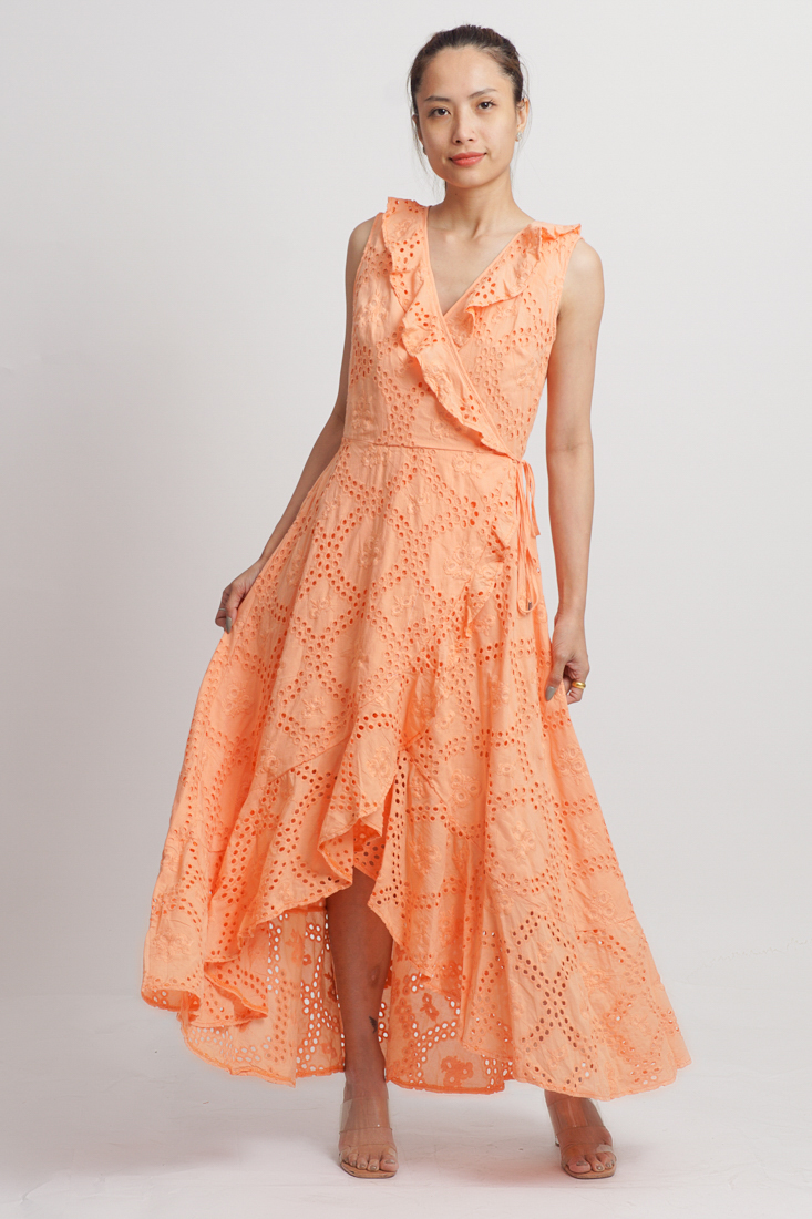 Maxi Cotton Cao Cấp Luna Llena, nền vải Lazer Cut độc đáo, tạo lỗ như ren, sang trọng, chất cotton dày dặn, thân trước đắp chéo, có thể tăng giảm eo. Phom rộng. Có lớp
