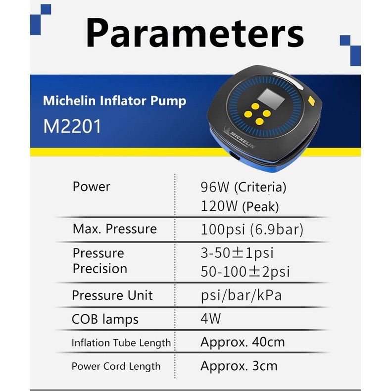 Máy bơm lốp đa năng Michelin M2202 - Hàng chính hãng THÔNG SỐ KỸ THUẬT - Thương hiệu: Michelin - Tên sản phẩm: máy bơm lốp đa năng - Mã sản phẩm: M2202 -