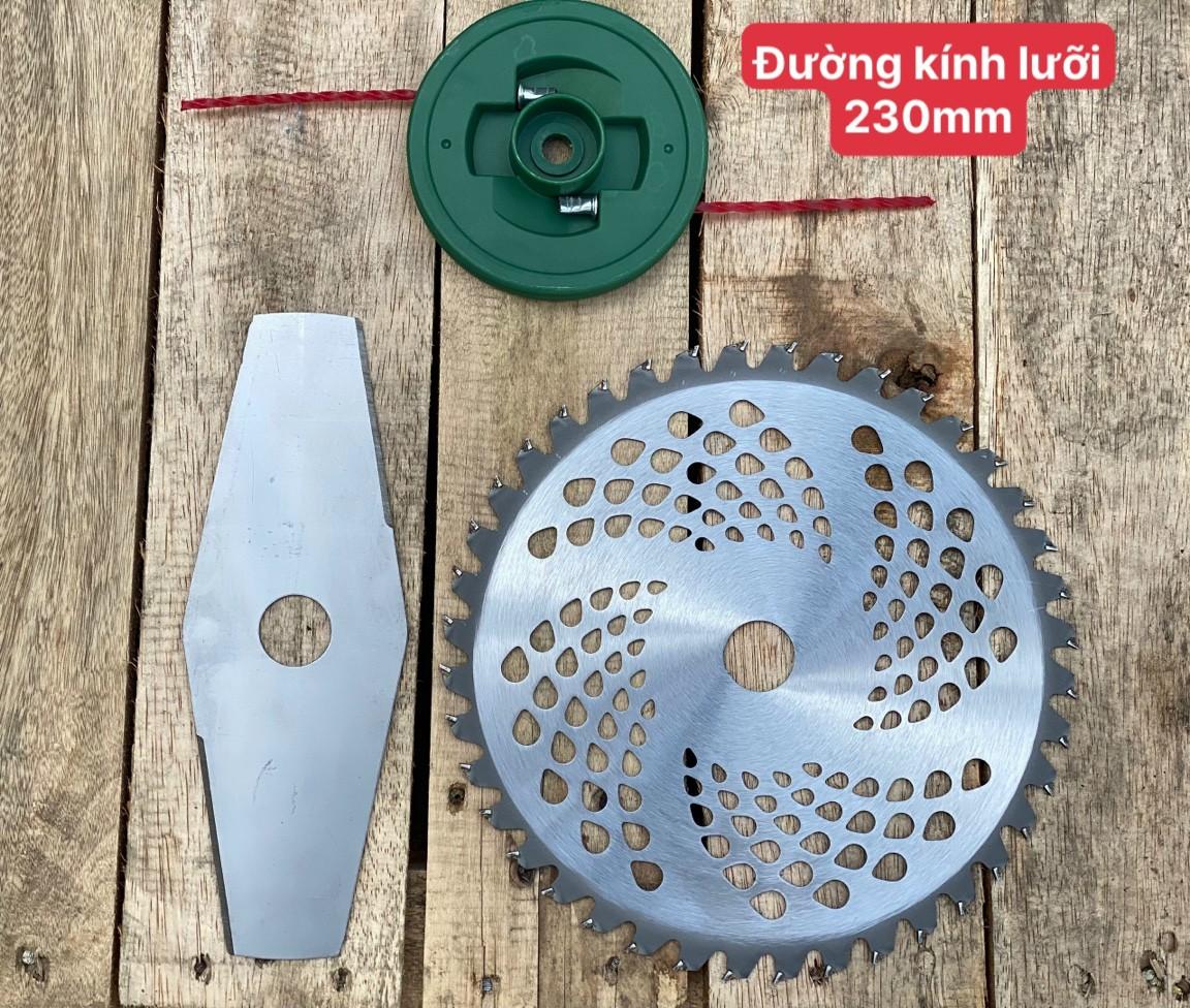 -Lưỡi cắt 230mm, 2 lưỡi, 1 lưỡi cước, lưỡi dùng chung với máy cắt cỏ xăng