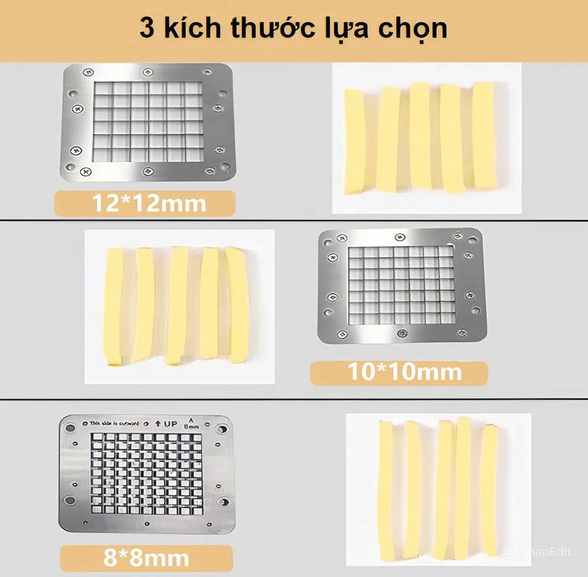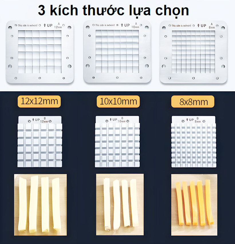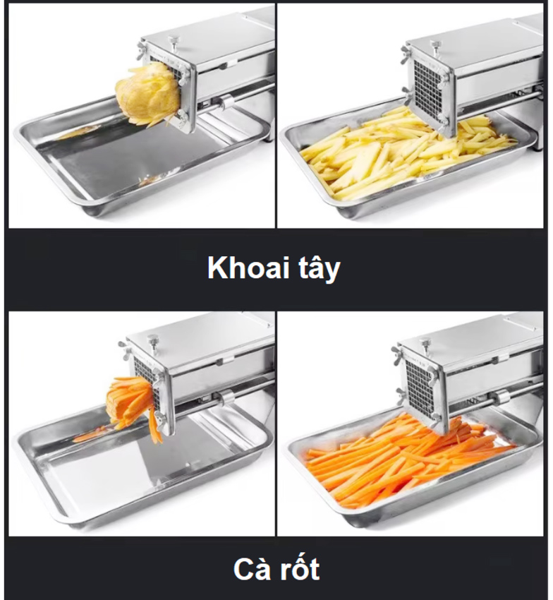 - Kinh doanh khoai chiên cùng với các món đồ ăn vặt, gà rán tuy không phải là mới nhưng chưa bao giờ bị bão hòa, ngược lại còn đem đến thu nhập cao bởi đây vẫn là món ăn vặt khoái khẩu, thơm ngon, hấp dẫn của giới trẻ. Để giúp công đoạn cắt khoai tại các cơ sở kinh doanh trở nên nhanh gọn, tiết kiệm thời gian, công sức. Giới thiệu máy cắt khoai tây, khoai lang và các loại củ kiểu Pháp chuyên nghiệp Septree T1000. Sản phẩm dùng để cắt khoai tây, khoai lang, cà rốt, su hào, dưa chuột…thành sợi vuông sợi dài, năng suất đạt từ 216– 250kg/ giờ.