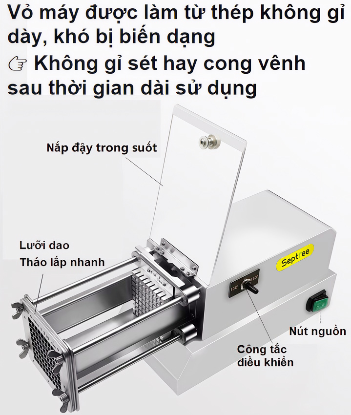 - Máy cắt rau củ Septree T1000 có chức năng cắt vuông nhiều loại củ quả như khoai lang, khoai tây, củ cải, cà rốt, su hào, dưa chuột… một cách nhanh chóng và đồng đều. Máy cắt khoai lang chiên thích hợp sử dụng trong các quầy đồ ăn nhanh, quán ăn vặt, KFC, quán cafe, nhà hàng, khách sạn hay các hộ kinh doanh nhỏ lẻ - Các món ăn từ khoai tây, khoai lang chiên, lắc đang là món ăn vặt hấp dẫn, và không thể thiếu trong thực đơn của các quán ăn nhanh, nhà hàng, hay cả trong các bếp ăn công nghiệp, bếp ăn trường học, các quán ăn vỉa hè,…