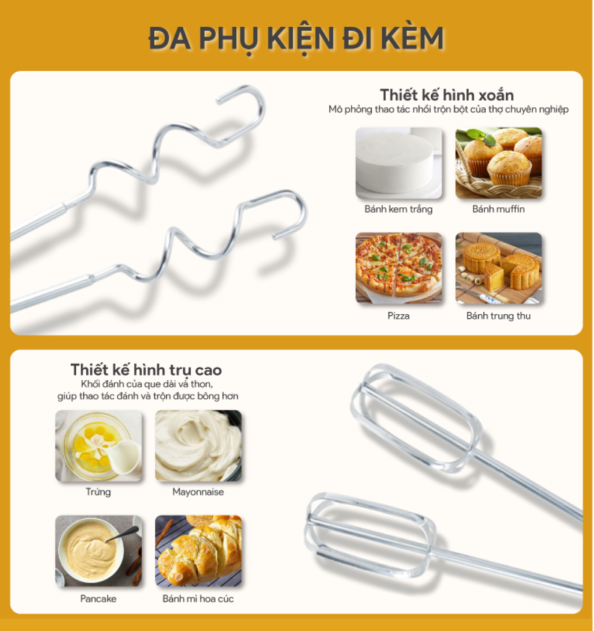 - Phụ kiện: 2 bộ dụng cụ chuyên biệt gồm các thanh đánh trứng và các thanh trộn bột bằng thép không gỉ cao cấp, bền bỉ.
