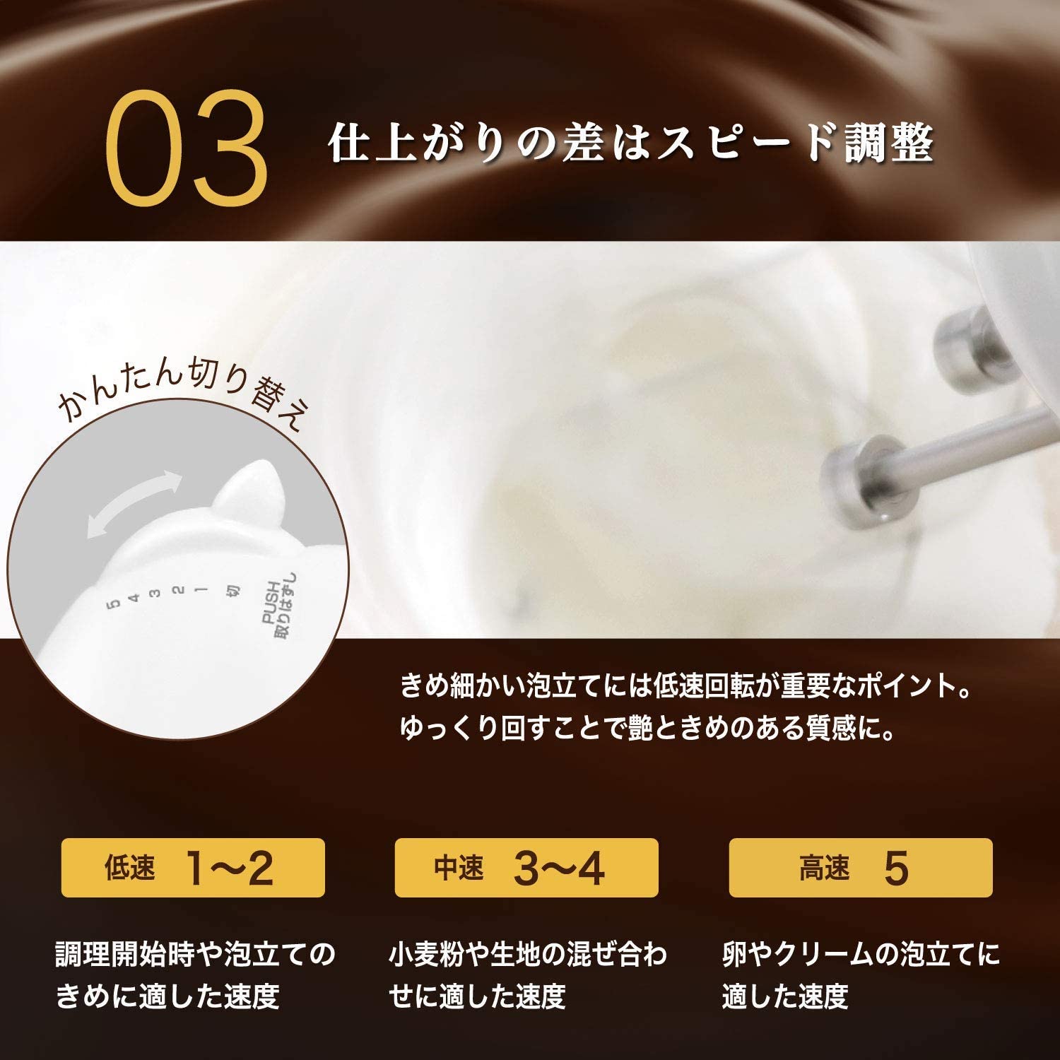 Máy trộn tay với động cơ 500 W gây ấn tượng với tốc độ và hiệu quả: đánh lòng trắng trứng trong 60 giây! (đã thử với 4 lòng trắng trứng và tốc độ 5).