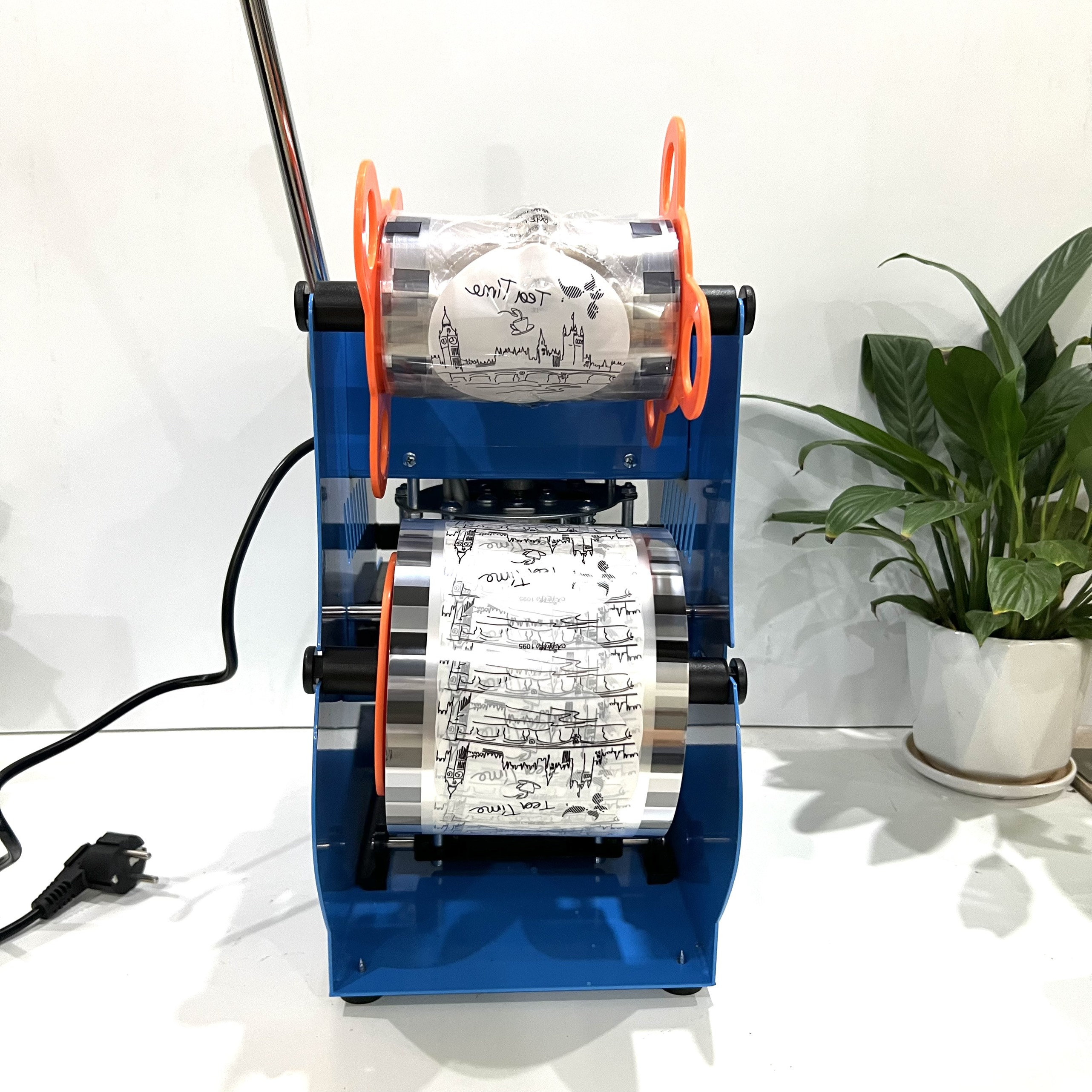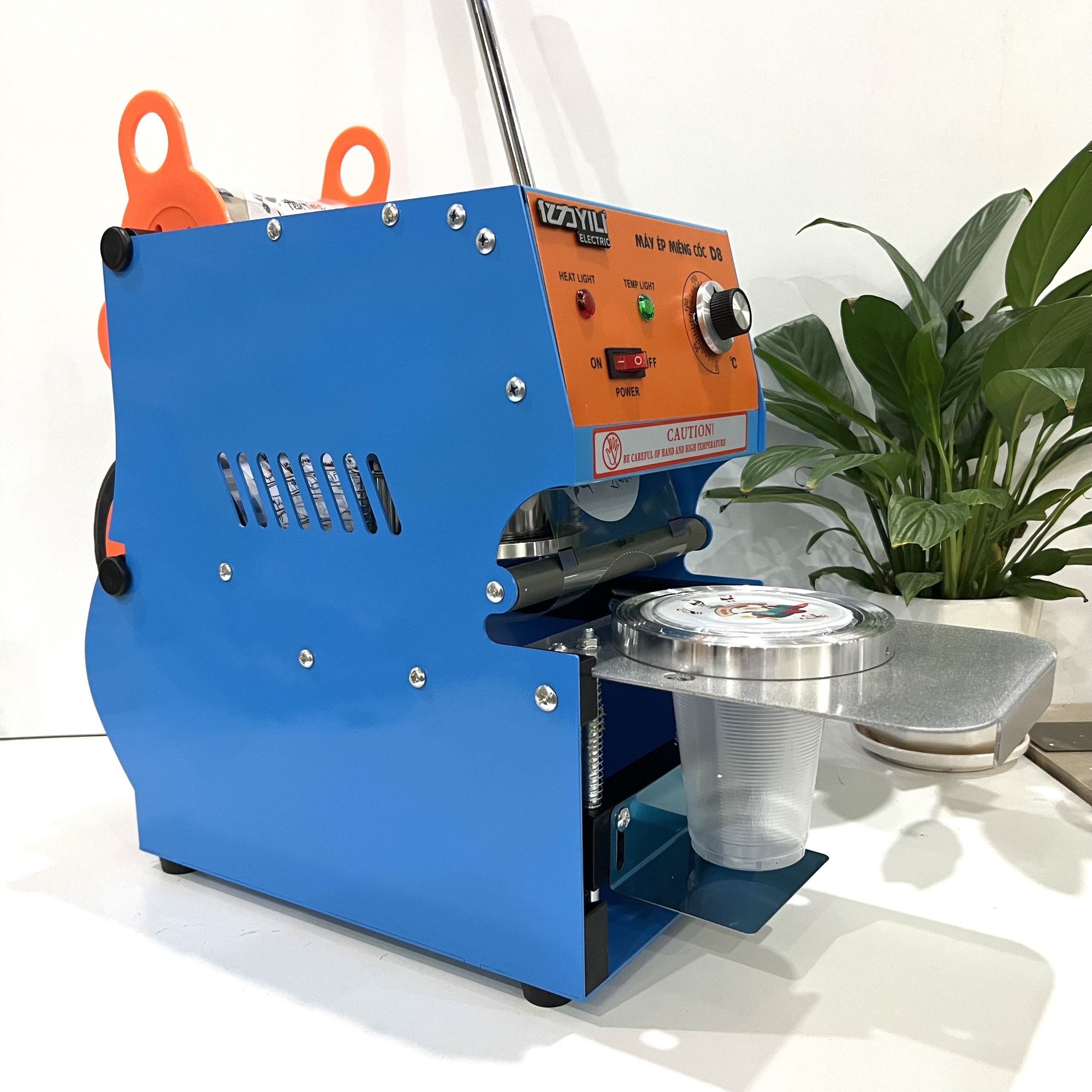 Nhiệt độ cao từ mâm nhiệt ra giúp miếng nhựa dán chặt vào miệng ly đồng thời cắt bỏ toàn bộ phần nhựa dư thừa. Chờ khoảng vài giây và nhấc mâm nhiệt lên Khi đó miệng ly đã hoàn toàn đóng kín ngăn chặn quá trình tan chảy của nước giữ nhiệt lại bên trong và đồng thời nhựa thừa sẽ bị kéo lên.