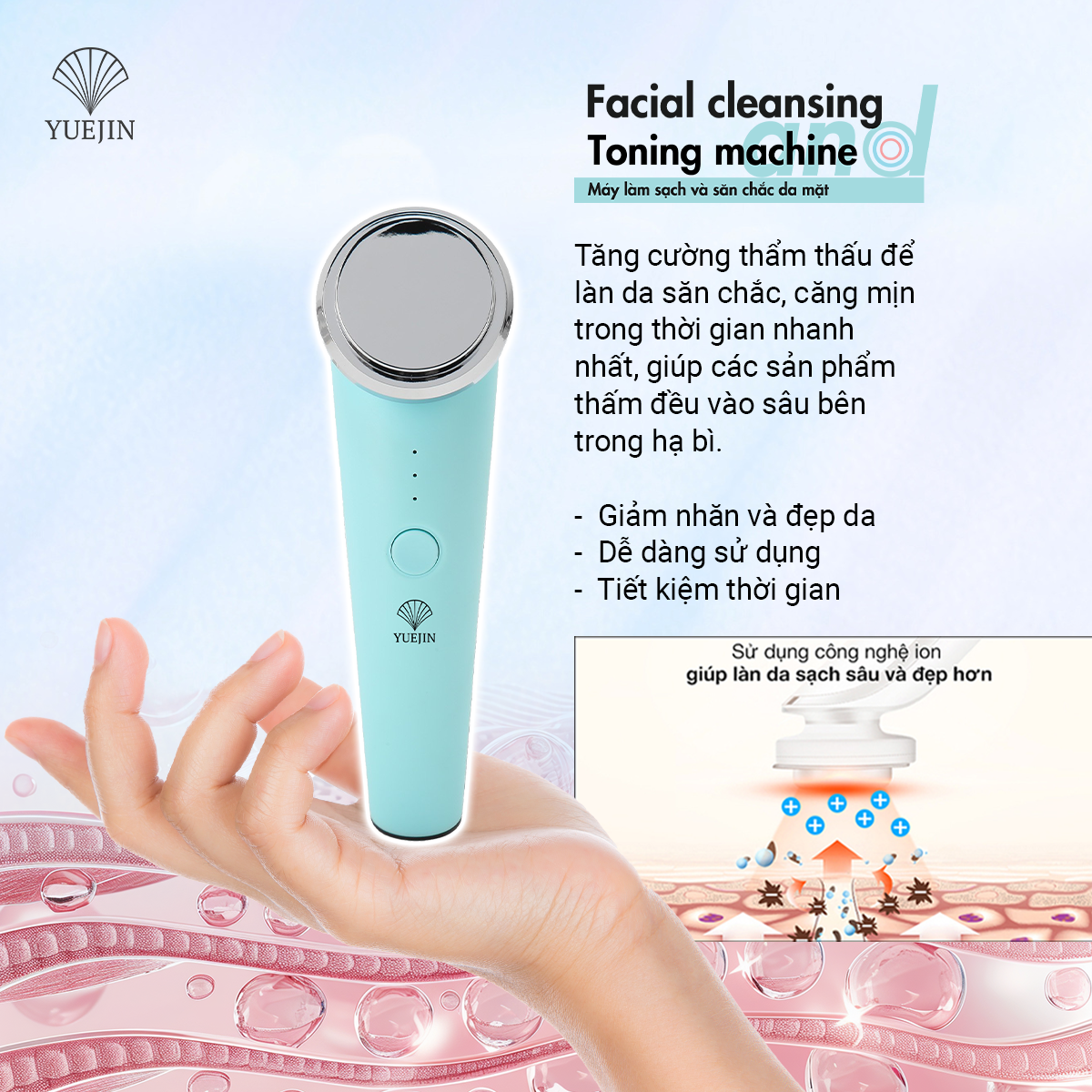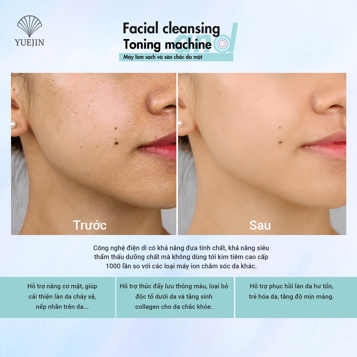Máy điện di tinh chất Facial Cleansing and Toning Machine hỗ trợ đẩy sâu các tinh chất vào da nhanh hơn gấp 20 lần. Kem dưỡng được thẩm thấu sâu dưới da, nâng cơ, chống nhăn và chống lão hóa, giúp da sáng hơn.