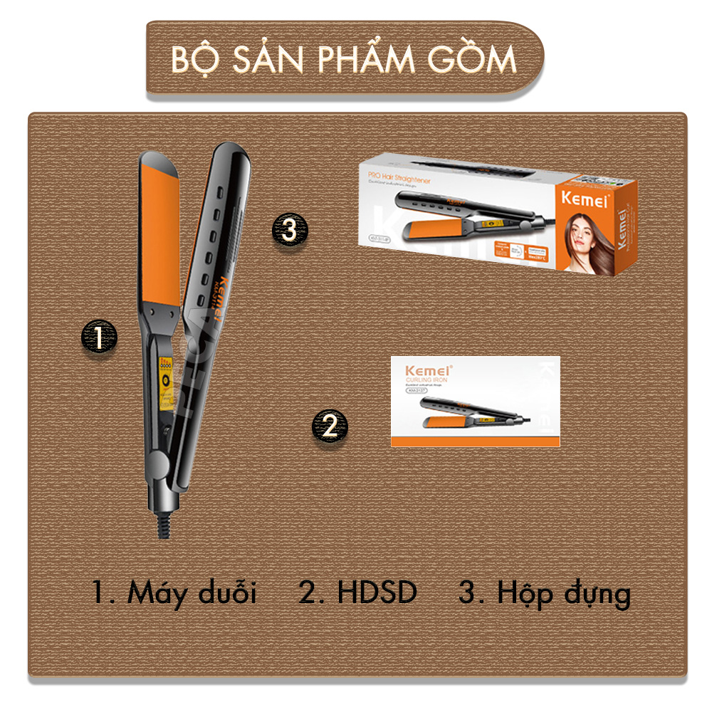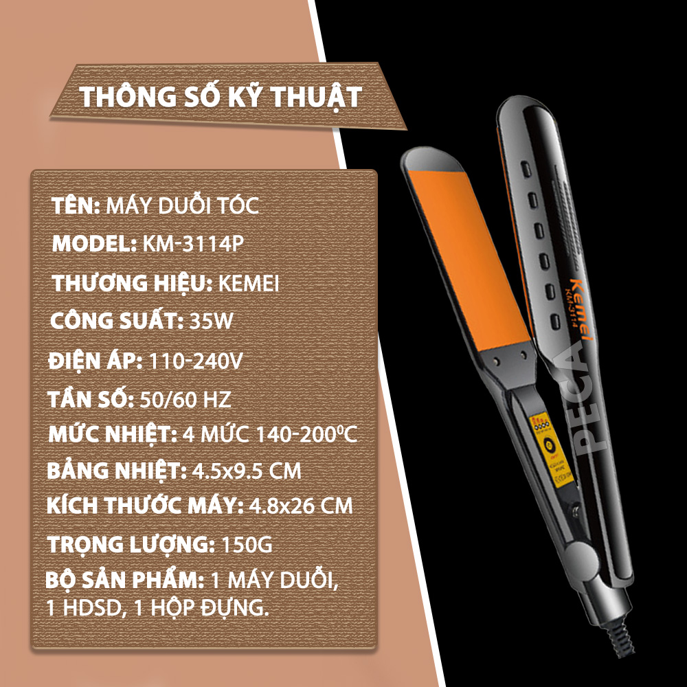 MÁY DUỖI TÓC KEMEI KM-3114P CHUYÊN NGHIỆP ĐIỀU CHỈNH 4 MỨC NHIỆT PHÙ HỢP SỬ DỤNG VỚI MỌI LOẠI TÓC - HÀNG CHÍNH HÃNG Bạn có bao giờ ước có thể biến mái tóc rối bù, không vào nếp thành suôn mượt chỉ trong vài phút? Mỗi sáng vội vã, bạn phải vật lộn với lược, máy sấy hay keo giữ nếp nhưng tóc vẫn không như ý? Bạn không cô đơn! Rất nhiều người gặp khó khăn khi tạo kiểu tóc mỗi ngày, đặc biệt là những ai có tóc dễ xoăn nhẹ, bông xù hoặc bị ảnh hưởng bởi thời tiết. Nhưng đừng lo, Máy duỗi tóc Kemei sẽ giúp bạn chinh phục mái tóc thẳng mượt, bóng khỏe nhanh chóng, tiết kiệm thời gian mà vẫn giữ được vẻ tự nhiên!   ƯU ĐIỂM NỔI BẬT: Máy duỗi tóc Kemei KM-3114P sử dụng tạo nhiều kiểu tóc chuyên dụng: duỗi thẳng, uốn cụp đuôi,...   1/ Ngoại quan sản phẩm: Thiết kế vỏ nhựa ABS an toàn, cứng cáp chịu lực tốt độ bền cao Màu sắc đen phối bảng cam huyền bí, cá tính, sang trọng đáp ứng mọi nhu cầu Máy có tay cầm chắc chắn, nhẹ nhàng, dây điện dài 1.7m sử dụng linh hoạt di chuyển sử dụng gốc rộng   2/ Cấu tạo bảng nhiệt: Cấu tạo ba lớp: