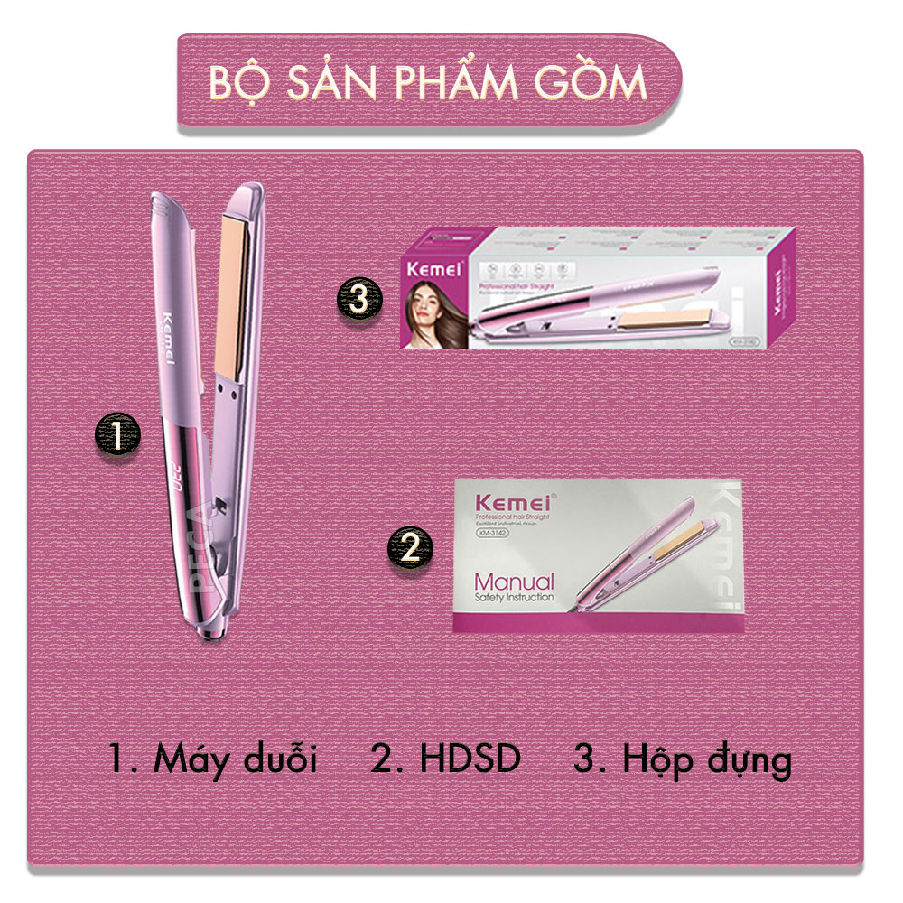 MÁY DUỖI TÓC KEMEI KM-3142 CHUYÊN NGHIỆP ĐIỀU CHỈNH 10 MỨC NHIỆT PHÙ HỢP SỬ DỤNG VỚI MỌI LOẠI TÓC - HÀNG CHÍNH HÃNG Máy duỗi tóc Kemei KM-3142 là sự lựa chọn hoàn hảo cho những ai muốn sở hữu mái tóc thẳng mượt mà như vừa được chăm sóc tại salon ngay tại nhà. Với thiết kế hiện đại, màu sắc dễ thương tông hồng nổi bật, máy không chỉ là một công cụ làm đẹp mà còn là phụ kiện thời trang đẳng cấp. ƯU ĐIỂM NỔI BẬT: Máy duỗi tóc Kemei KM-3142 sử dụng tạo nhiều kiểu tóc chuyên dụng: duỗi thẳng, uốn cụp đuôi,.. 1/ Cấu tạo bảng nhiệt: Cấu tạo ba lớp: