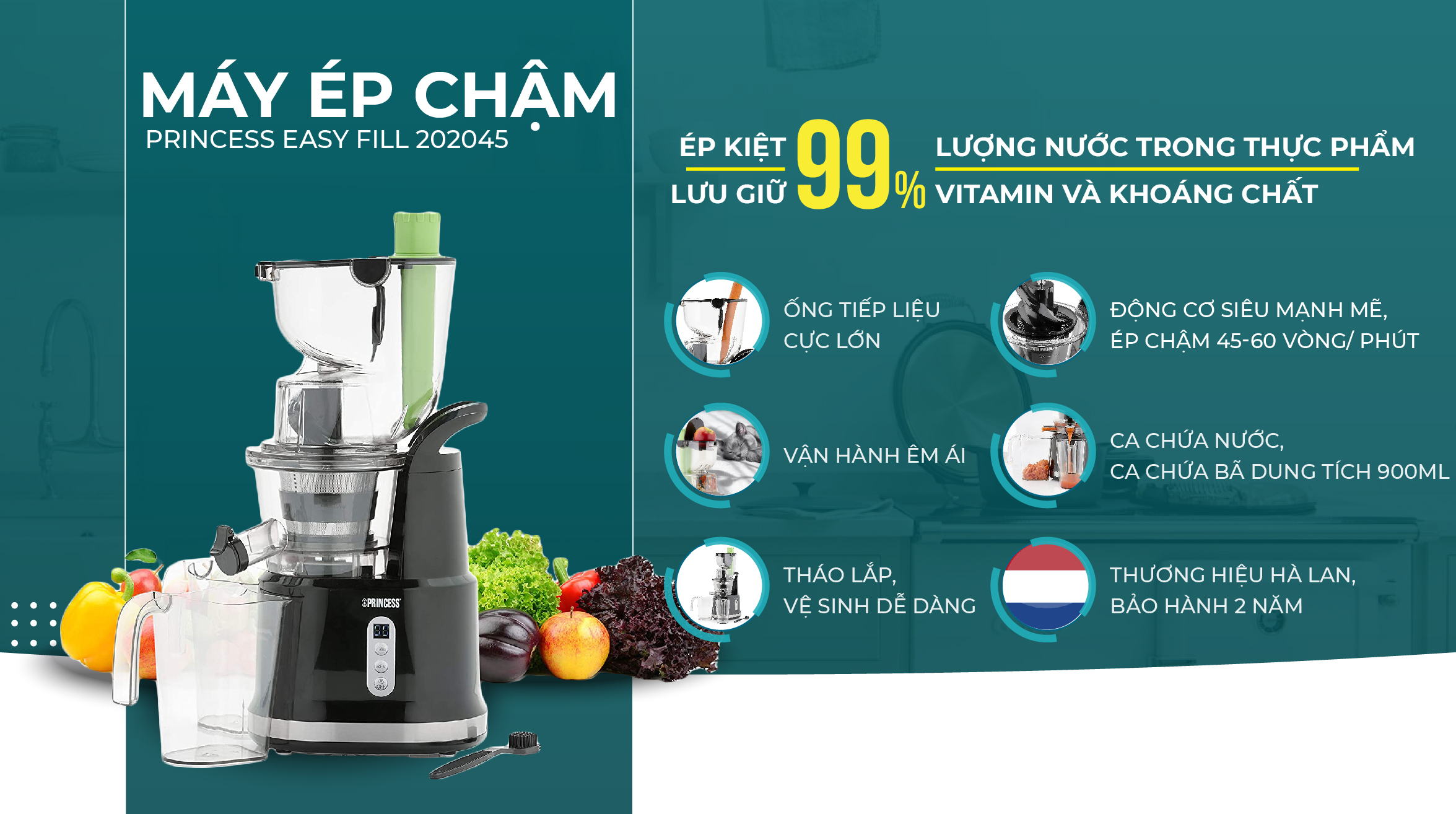 Sử dụng máy ép chậm Princess Easy Fill 202045, bạn có thể ép kiệt 99% lượng nước trong thực phẩm, lưu giữ 99% vitamin và khoáng chất, vượt trội hoàn toàn so với các loại máy ép khác trên thị trường