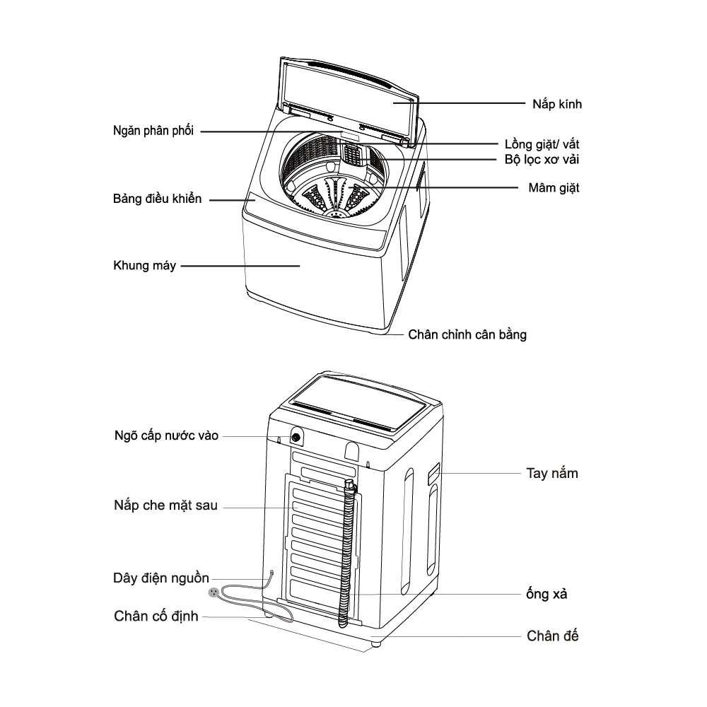 Tổng quan thiết kế - Kiểu dáng: máy giặt lồng đứng - cửa trên. - Bảng điều khiển: nút nhấn có màn hình hiển thị, sử dụng tiếng Việt đơn giản, dễ dùng. - Nắp máy: chất liệu kính