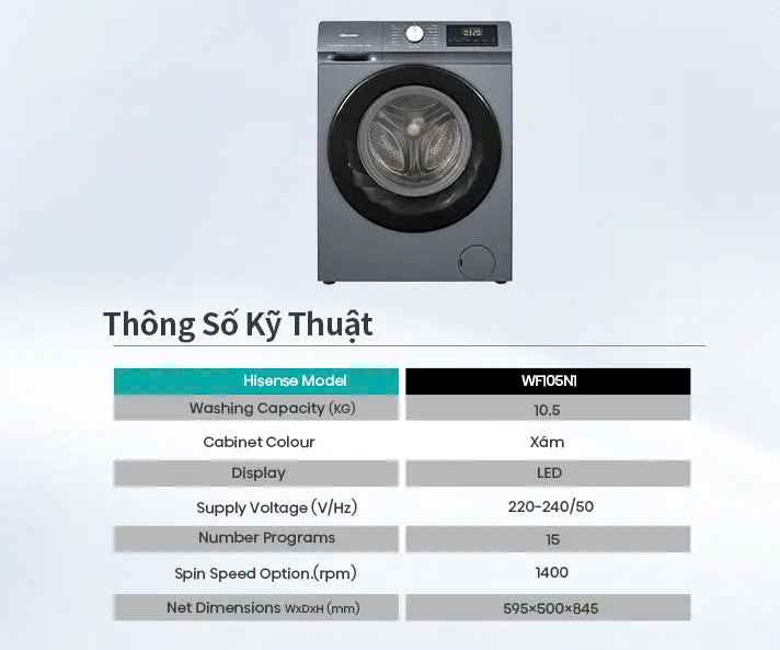 Máy giặt Hisense Inverter WF105N1 với thiết kế hiện đại, khối lượng giặt 10.5 kg phù hợp với gia đình 5-7 thành viên, máy tích hợp đa dạng nhiều chương trình giặt thông minh và nhiều công nghệ giặt hữu ích như Công nghệ giặt hơi nước Allergy Care loại bỏ vi khuẩn và ngăn ngừa các tác nhân gây dị ứng, Pure Jet - Làm sạch mặt trong cửa,... (*) Chương trình giặt Máy giặt Hisense Inverter Pro 10.5 kg WF105N1 15 chương trình giặt: Đồ trẻ em, Vải lụa, Giặt AI, Đồ len, Đồ hỗn hợp, Đồ cotton, Áo sơ mi, Xả + vắt, Vệ sinh lồng giặt, Vắt, Ngâm, Giặt nhanh 15 phút, Giặt ngừa dị ứng, Chăn mền, Chăn lông vũ. (**) Thông số cơ bản Máy giặt Hisense Inverter Pro 10.5 kg WF105N1
