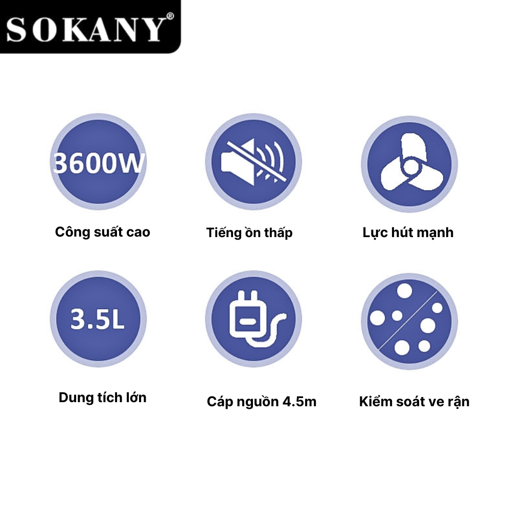THÔNG SỐ KỸ THUẬT CỦA MÁY HÚT BỤI ĐA NĂNG 8IN1 SOKANY: - Thương hiệu: SOKANY - Công suất: 3600W - Điện áp: 220V - Dung tích: 1,7L - 8 loại đầu hút - Chất
