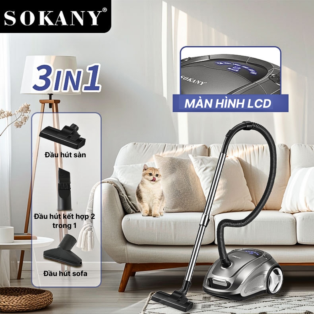 - Máy hút bụi tay SOKANY sở hữu tới 3 đầu hút bụi bao gồm: hút sàn, hút giường đệm, sofa và hút khe hẹp. -- - Với số lượng đầu hút nhiều như vậy giúp đáp ứng nhiều nhu cầu sử dụng khác nhau như vệ sinh sàn nhà, kệ, sofa, giường đệm, cầu thang, nội thất xe ô tô,… Ngoài ra, máy còn được trang bị ống nhôm Anodized siêu nhẹ, chống trầy xước.