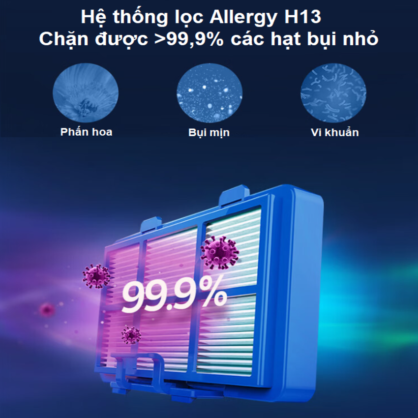 • Đầu hút MultiClean được thiết kế để hút sát vào mặt sàn, đảm bảo làm sạch kỹ lưỡng trên tất cả các loại sàn. Hệ thống lọc Allergy H13 chặn được >99,9% các hạt bụi nhỏ
