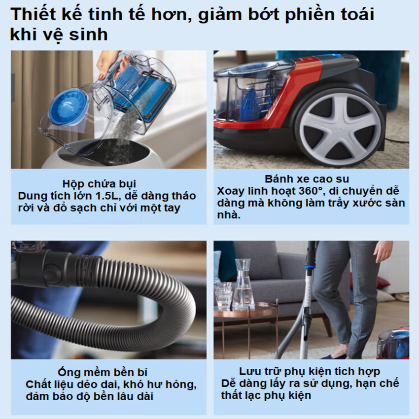 Công nghệ hút bụi lốc xoáy hiện đại không túi chứa bụi Đặc biệt thiết thực nhờ thiết kế nhỏ gọn Dễ dàng đổ sạch hộp chứa bụi chỉ bằng một nút nhấn Xử lý