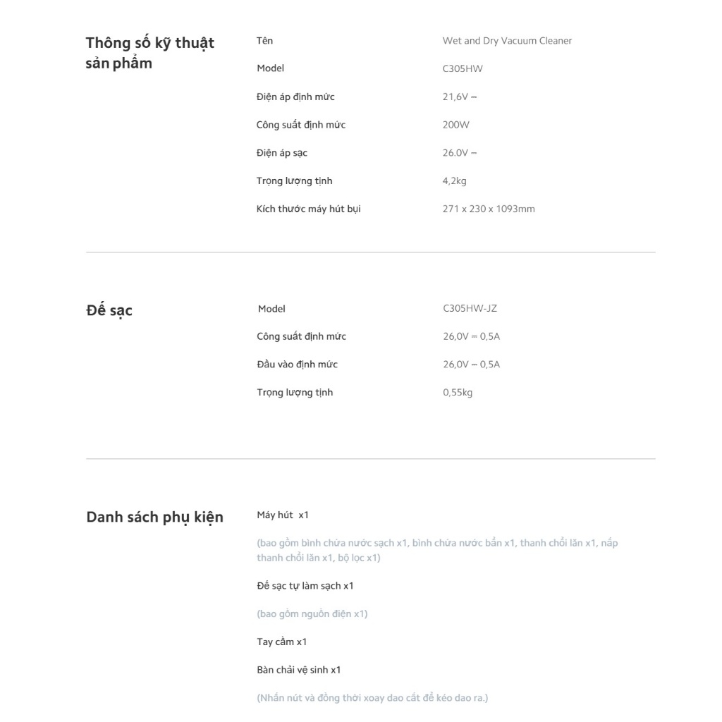 Thông số kĩ thuật: Thương hiệu: Deerma Model: DEM-CM980 Điện áp đầu vào: 220V~50Hz Công suất định mức: 450W Lực hút: >13kPa Trang bị: Tia UV khử trùng, sấy khô khí nóng 60°C Độ ồn