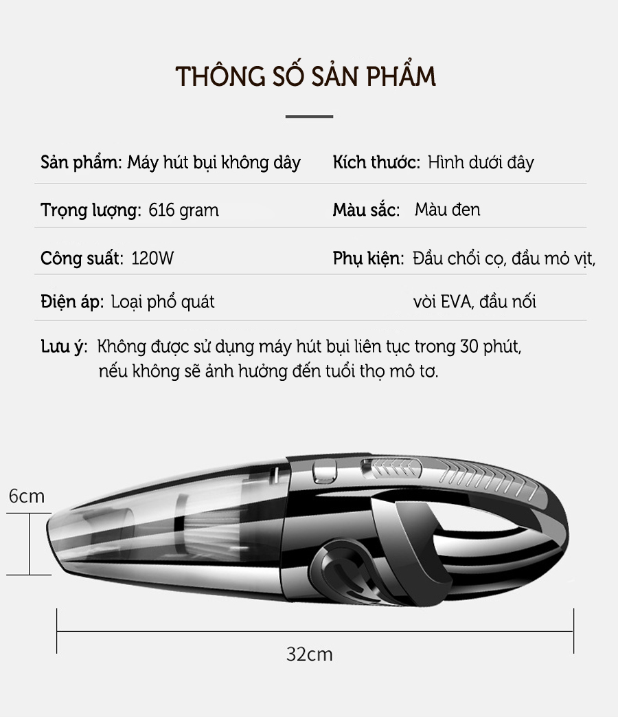 Sản phẩm được mua bao gồm - 01 Thân máy - 01 Sạc thường - 01 Pin 1.5Ah - 01 Đầu hút T - 01 Đầu hút khe - 01 Bộ lọc trước Đặc điểm