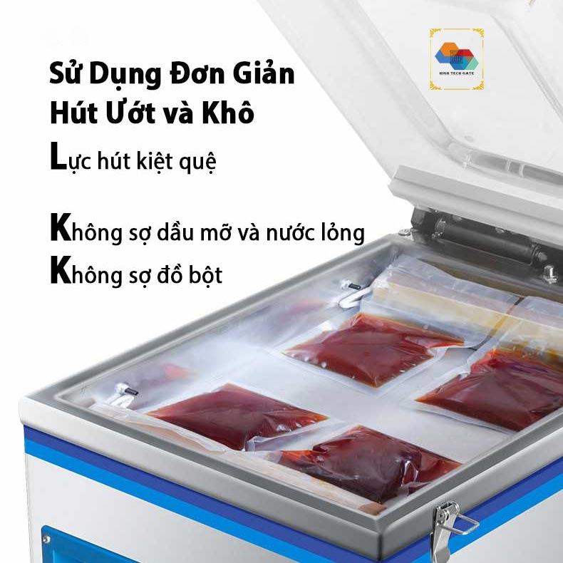 Máy hút chân không không kén túi, thiết kế thông minh tự động, sử dụng với các loại túi nhựa hút chân không trơn, dễ dàng mua túi phổ biến trên thị trường. Máy hút