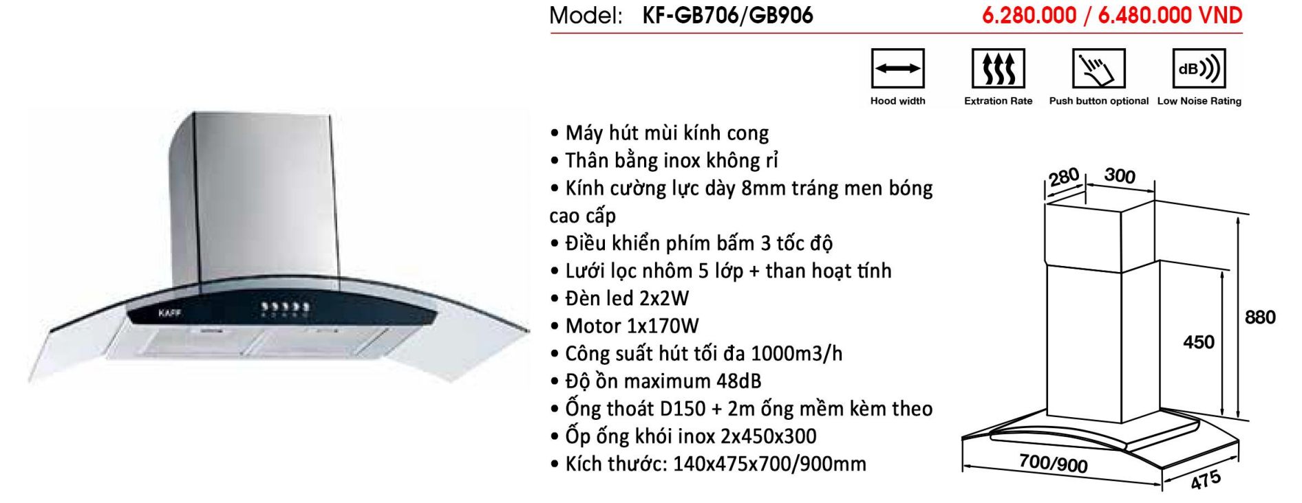 Thông số kỹ thuật: • Máy hút mùi kính cong • Thân máy bằng inox sáng đẹp • Kính cường lực dày 5mm tráng men bóng cao cấp • Điều khiển phím bấm 3 tốc