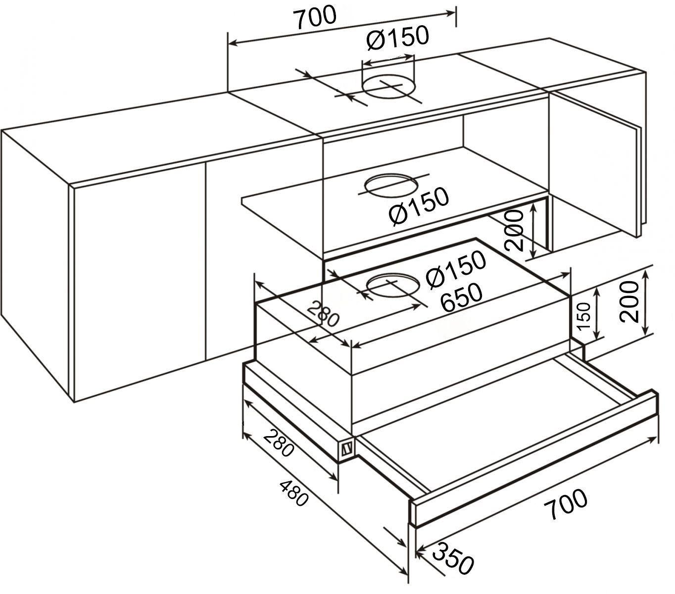 Gắn cố định vào tủ bếp, sau khi gắn vào khoang tủ sẽ chỉ nhìn thấy mặt trước của máy nên rất gọn gàng và đẹp mắt. Rãnh kéo tấm lọc trơn trượt, đẩy ra vào dễ dàng mỗi khi máy hoạt động. Máy hút mùi DANN DSY 7002P có kích thước 700 mm, được thiết kế với chất liệu thép phủ sơn tĩnh điện màu trắng, thích hợp với nhiều không gian bếp và mang đến bầu không khí sạch, trong lành cho ngôi nhà bạn.