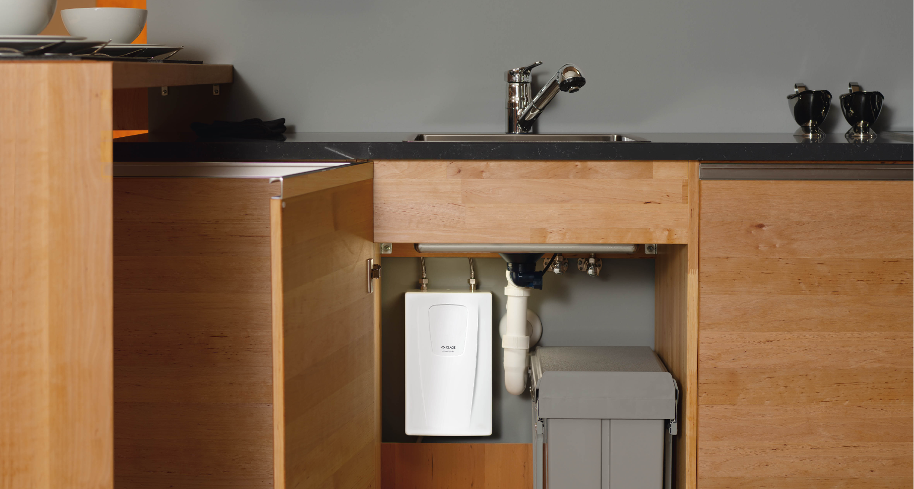 Ví dụ, một máy đun nước nóng tức thì CLAGE có thể được vận hành với nguồn kết nối điện hiện có của bếp điện cơ. Khi pha chế nước nóng, máy nước nóng tức thì sẽ tạm thời tắt bếp. Điều này hầu như không đáng chú ý, vì nồi đã duy trì nhiệt độ cần thiết để tiếp tục nấu hoặc nướng trong thời gian ngắn khi nước từ bình nước nóng tức thì CLAGE được sử dụng. > trang 54
