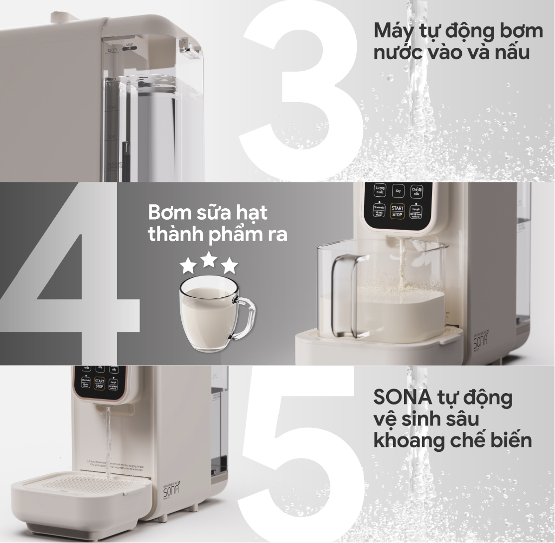 - Rảnh tay mà vẫn Healthy? Hãy để Sona i8 phục vụ bạn + Tự động bơm nước chính xác và nấu theo dung tích cài đặt (300ml/600ml/900ml/1200ml) + Tự động nấu và rót thành phẩm ra cốc + Tự động bơm nước vệ sinh + Tự động trút nước bẩn ra khay hứng + Hộp nước nguồn phía sau máy tiện dụng để nấu sữa và tự bơm vệ sinh + Bảng điều khiển Tiếng Việt với 9 chế độ cài đặt sẵn (có chế độ không nấu chỉ xay) + Công suất đun 1000w, công suất xay 800w