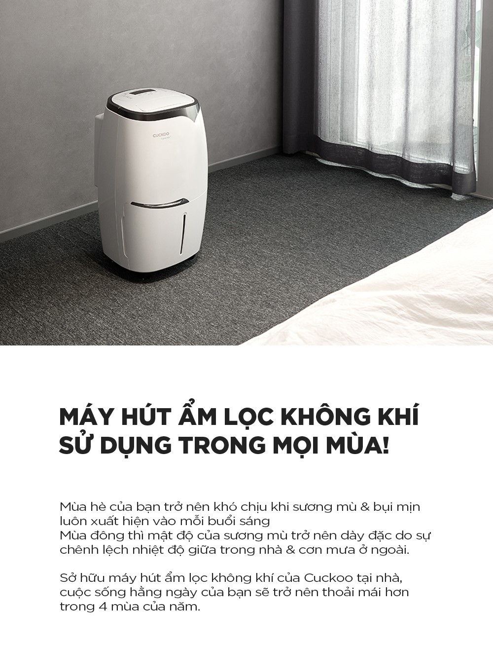 Tính năng nổi bật – Khả năng hút ẩm mạnh mẽ, mang đến nguồn không khí trong lành trong mùa mưa ẩm ướt – Tích hợp nhiều bộ lọc không khí, giúp loại bỏ 5