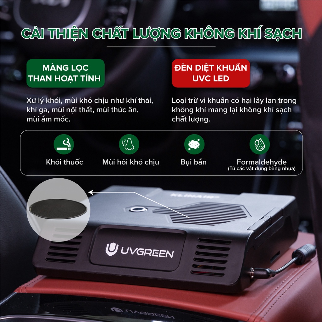 Máy Lọc Không Khí Ô Tô, Khử Mùi, Diệt Khuẩn UVGREEN KA100 - Công Nghệ UVC LED Từ Mỹ, Lõi Lọc Than Hoạt Tính Lọc Bụi Mịn, Loại Bỏ Mùi - Bảo Hành 12 Tháng — THÔNG SỐ KỸ THUẬT: • Công suất lọc (CADR): 10m3/h • Diện tích sử dụng: xe hơi • Nơi sử dụng lý tưởng: Ô tô • Điện áp: 12V • Nguồn điện: Tẩu sạc xe hơi • Mức tiêu thụ điện: 2W • Độ ồn tối thiểu - tối đa: 25-40 dB • Tốc độ gió 3 mức: Thấp - Cao - Tự Động • Kích thước (D x R x C): 20 x 18 x 4.5 cm • Trọng lượng tịnh: 720g ~ 1,59lb • Bộ sản phẩm bao gồm: 1 máy lọc không khí, 1 bộ lọc Than Hoạt Tính (được cài đặt sẵn), 2 bộ diệt khuẩn True UVC ( đã cài đặt sẵn), 1 bộ cấp nguồn, 1 phiếu bảo hành, 1 sách HDSD. — CÔNG NGHỆ VƯỢT TRỘI - HIỆU QUẢ TỐI ƯU: Diệt khuẩn bằng Công nghệ UVC LED bởi Bolb Inc tại Mỹ với hiệu suất diệt khuẩn 99.99%. • Các dòng sản phẩm Máy Lọc Không Khí UVGREEN được ứng dụng công nghệ UVC LED tiên tiến hàng đầu thế giới. UVC LED phát ra tia cực tím ở bước sóng ổn định, diệt khuẩn mạnh mẽ với tuổi thọ lên tới 10.000 giờ. Được kiểm chứng đạt các tiêu chuẩn của Châu Âu về an toàn hóa học cho người dùng bao gồm RoHS, REACH và an toàn Ozone.     — TÍNH NĂNG SẢN PHẨM: Thiết kế tinh tế sang trọng, nhỏ gọn thích hợp cho xe hơi: Máy lọc không khí UVGREEN KA100 với thiết kế hình hộp chữ nhật kết hợp với màu đen đơn giản nhưng không kém phần tinh tế, sang trọng. Vỏ máy lọc không khí được làm bằng nhựa và được thiết kế liền mạch, không chỉ giúp bảo vệ các bộ phận bên trong máy mà còn bảo vệ an toàn người sử dụng nhất không gian bên trong xe ô tô.   Được trang bị màng lọc Than Hoạt Tính lọc bụi mịn và mùi hôi hiệu quả: Màng lọc than hoạt tính có hiệu quả lọc tốt giữ lại: Khói thuốc, khói ô nhiễm; các chất hữu cơ gây dị ứng và mùi thức ăn để cung cấp một luồng không khí sạch, trong lành.. • Thời gian thay thế: 3~6 tháng.     Chỉ với 1 nút nhấn: Dễ dàng điều chỉnh cấp độ gió phù hợp với 3 cấp độ bằng một nút bấm. Chế độ Thấp: Máy vận hành êm ái, với độ ồn thấp giúp bạn và gia đình có giấc ngủ sâu và ngon hơn. Chế độ Cao: tốc độ hoạt động lọc không khí nhanh hơn. *Chế độ Tự Động: Tự điều chỉnh tốc độ lọc theo chỉ số ô nhiễm không khí theo thời gian thực. Đèn UV giúp loại bỏ 99.99% các loại vi khuẩn, virus trong không khí.     — CHÍNH SÁCH BẢO HÀNH Chi tiết xem trên Phiếu Bảo Hành khi mua hàng. Bảo hành 12 tháng đối với Thiết Bị/ 12 tháng đối với chip UVC LED. Đổi, trả hàng trong vòng 7-15 ngày nếu sản phẩm không đúng như mô tả. Đổi mới nếu sản phẩm phát sinh lỗi do nhà sản xuất. — UVGREEN là chuyên gia về sản phẩm gia dụng ứng dụng công nghệ diệt khuẩn hiện đại.   Tầm nhìn thương hiệu: Trở thành biểu tượng niềm tin hàng đầu Việt Nam về sản phẩm công nghệ thông minh bảo vệ sức khỏe con người.   Sứ mệnh thương hiệu: UVGREEN cam kết mang đến cho mọi gia đình Việt các sản phẩm công nghệ hướng đến bảo vệ sức khỏe toàn diện. Trên nền tảng công nghệ diệt khuẩn UVC hiện đại, chúng tôi nỗ lực loại bỏ các rủi ro với sức khỏe người tiêu dùng, mang đến cho mọi gia đình Việt một không gian sống sạch và yên vui. __
