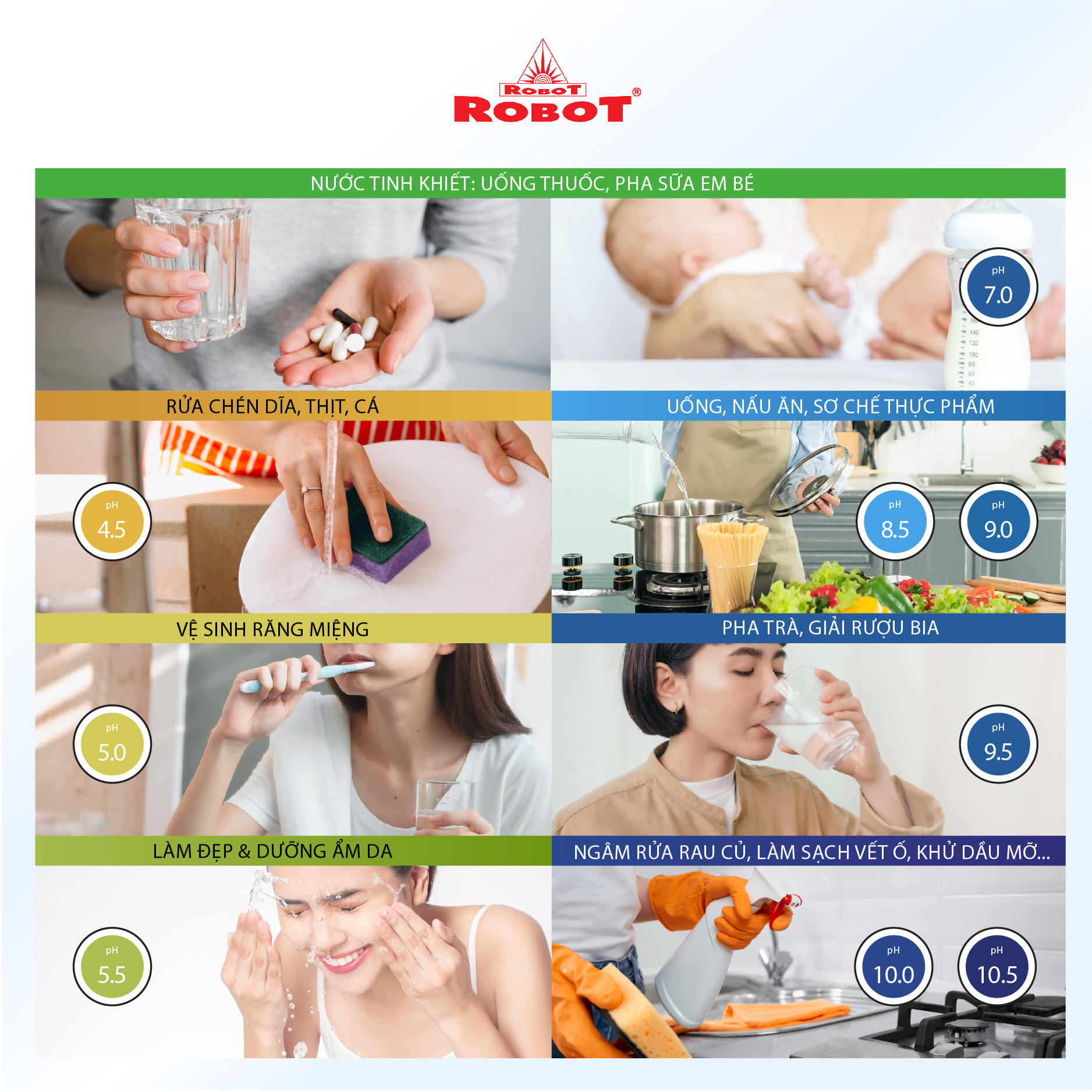 - Và 3 mức nước iON axit (pH 4.5/5.0/5.5). Chất lượng nước đạt chỉ số tối ưu, nồng độ Hydro hoạt tính lên đến ~ 750 -> 850 ppb, chống oxy hóa (ORP) lên đến ~ -350 -> -500 mV, đáp ứng mọi nhu cầu sử dụng trong cuộc sống. Máy lọc nước điện giải iON kiềm Nóng Lạnh ROBOT ionKing là dòng Tủ Đứng đầu tiên trên thế giới, được thiết kế kiểu dáng hiện đại, thiết kế chinh phục mọi không gian. Đặc biệt, được tích hợp thêm chức năng Nóng Thông Minh – Lạnh độc đáo & duy nhất trên thị trường, mang lại nhiều tiện ích cho người dùng. Chỉ số Hydrogen, ORP của nước tùy thuộc số tấm điện cực, đặc tính nguồn nước & “điều kiện đo trong phòng thí nghiệm chuyên nghiệp, đạt chuẩn”. Máy lọc nước điện giải iON kiềm Nóng Lạnh ROBOT ionKing 511, tạo 11 loại nước bổ ích, pH 4.5 --> 10.5 - Đáp ứng mọi nhu cầu trong cuộc sống Có thể tham khảo ý kiến của Bác sĩ hoặc chuyên gia dinh dưỡng để được hướng dẫn loại nước uống phù hợp nhất cho cơ thể. Kiểu dáng hiện đại - Thiết kế chinh phục mọi không gian