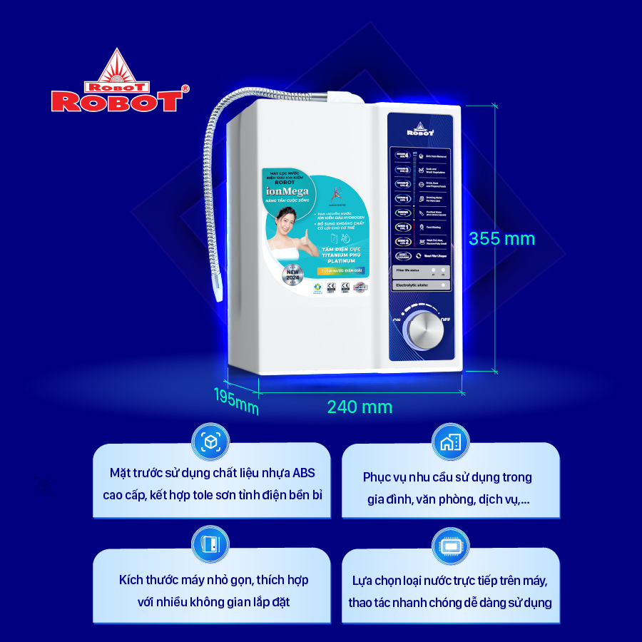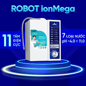 Máy lọc nước điện giải ion kiềm ROBOT ionMega 117 Máy lọc nước điện giải ion kiềm ionMega – thiết kế mới nhất, độc đáo siêu tiết kiệm với đầy đủ công năng của một máy điện giải ion kiềm đạt chuẩn quốc tế. ROBOT ionMega được thiết kế tối giản, nhỏ gọn, thao tác lấy nước trong một lần chạm, đáp ứng nguồn nước điện giải ion kiềm 24/24 tốt cho sức khỏe & sinh hoạt.   Chỉ số Hydrogen, ORP của nước tùy thuộc số tấm điện cực, đặc tính nguồn nước & “điều kiện đo trong phòng thí nghiệm chuyên nghiệp, đạt chuẩn”.