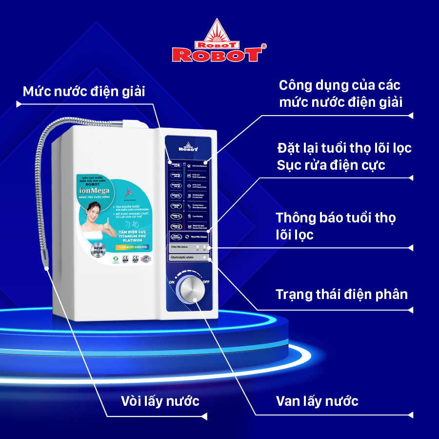 Máy lọc nước điện giải ion kiềm ROBOT ionMega 117 Máy lọc nước điện giải ion kiềm ionMega – thiết kế mới nhất, độc đáo siêu tiết kiệm với đầy đủ công năng của một máy điện giải ion kiềm đạt chuẩn quốc tế. ROBOT ionMega được thiết kế tối giản, nhỏ gọn, thao tác lấy nước trong một lần chạm, đáp ứng nguồn nước điện giải ion kiềm 24/24 tốt cho sức khỏe & sinh hoạt.   Chỉ số Hydrogen, ORP của nước tùy thuộc số tấm điện cực, đặc tính nguồn nước & “điều kiện đo trong phòng thí nghiệm chuyên nghiệp, đạt chuẩn”.