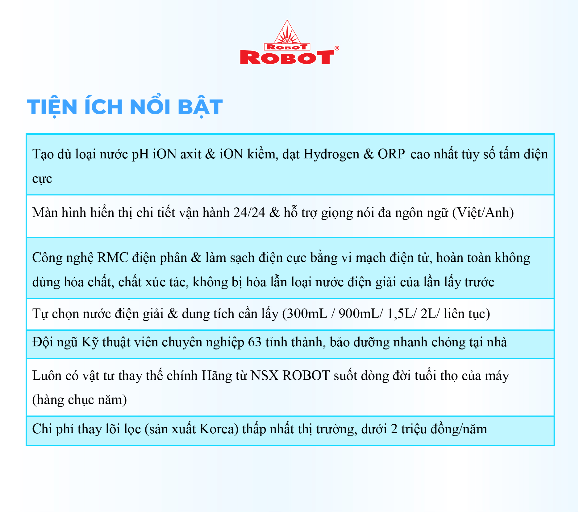 - Hệ thống điều khiển cảm ứng trên mặt phủ kính với màn hình LCD tinh tế +++ Với mong muốn nhiều gia đình Việt có thể sử dụng nước điện giải iON kiềm với chi phí hợp lý để bảo vệ sức khỏe, sắc đẹp & nâng cao chất lượng cuộc sống, ROBOT mang đến sản phẩm “Chất lượng Quốc tế - Giá thành Việt Nam”, phù hợp với mức sống của nhiều người. Tiết kiệm cho người tiêu dùng đến hơn một nửa chí phí so với máy nhập khẩu chỉ từ 30 50%, nhưng sở hữu nhiều ưu điểm, tính năng vượt trội, chất lượng cao.