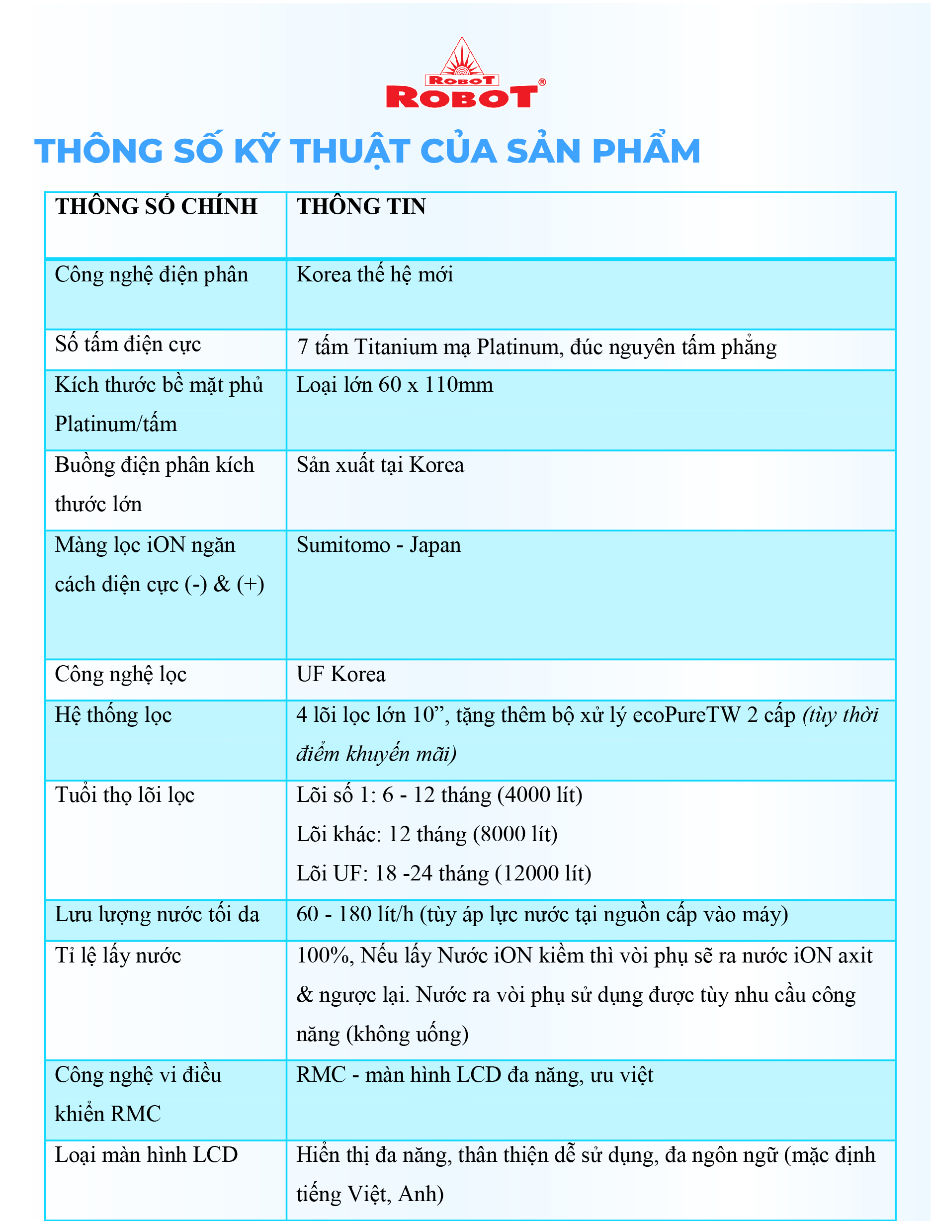 ️ Máy lọc nước điện giải iON kiềm ROBOT ionPrince 79 là sản phẩm được sản xuất với công nghệ tiên tiến, cao cấp trang bị đến 7 tấm điện cực lớn nhất, có khả năng tạo ra đến 9 loại nước đa chức năng, với 5 mức nước iON kiềm (pH 8.5 – 10.5), nước lọc trung tính (pH 7.0) & 3 mức nước iON axit (pH 4.5 - 5.5). Chất lượng nước đạt chỉ số tối ưu, nồng độ Hydro hoạt tính lên đến ~800 -> 950 ppb, chống oxy hóa (ORP) lên đến ~ -400 -> -600 mV, đáp ứng mọi nhu cầu sử dụng trong cuộc sống.