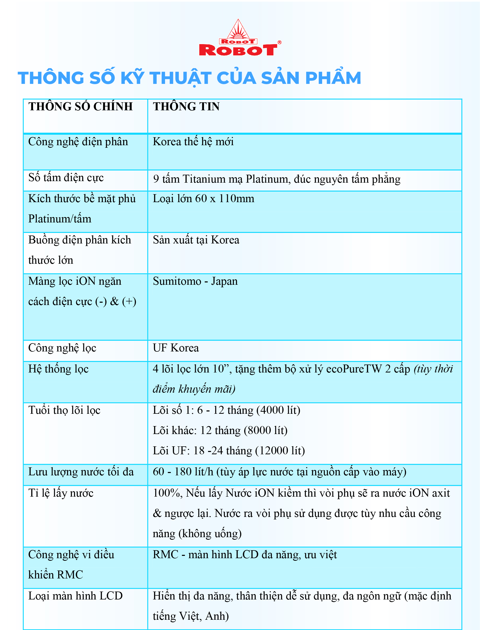 Với mong muốn nhiều gia đình Việt có thể sử dụng nước điện giải iON kiềm với chi phí hợp lý để bảo vệ sức khỏe, sắc đẹp & nâng cao chất lượng cuộc sống, ROBOT mang đến sản phẩm “Chất lượng Quốc tế - Giá thành Việt Nam”, phù hợp với mức sống của nhiều người. Tiết kiệm cho người tiêu dùng đến hơn một nửa chí phí so với máy nhập khẩu chỉ từ 30 – 50%, nhưng sở hữu nhiều ưu điểm, tính năng vượt trội, chất lượng cao.