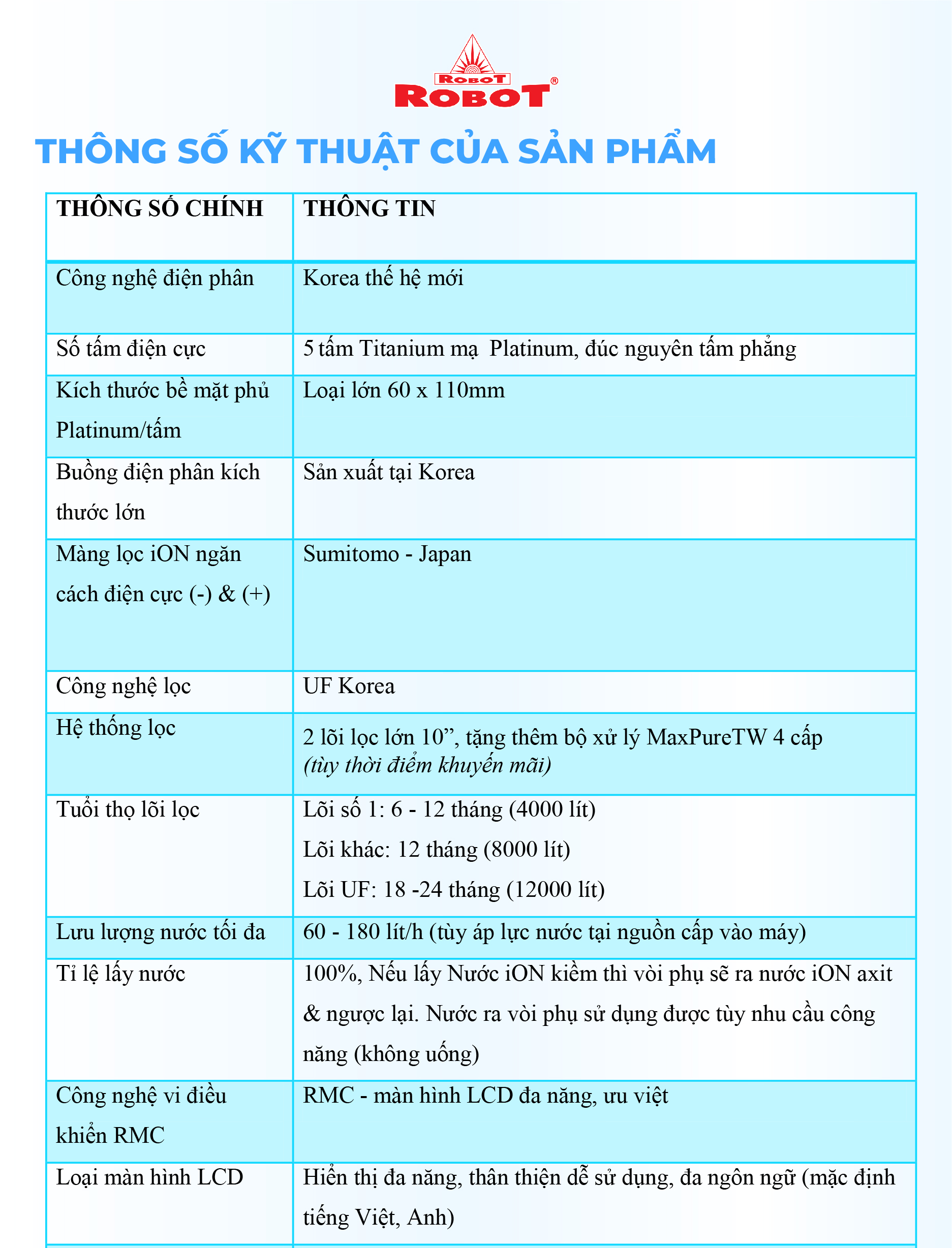 - Và 3 mức nước iON axit (pH 4.5/5.0/5.5). Chất lượng nước đạt chỉ số tối ưu, nồng độ Hydro hoạt tính lên đến ~ 750 -> 850 ppb, chống oxy hóa (ORP) lên đến ~ -350 -> -500 mV, đáp ứng mọi nhu cầu sử dụng trong cuộc sống. Máy lọc nước điện giải iON kiềm Nóng ROBOT ionSmart được thiết kế kiểu dáng hiện đại, thiết kế chinh phục mọi không gian. Đặc biệt, bộ sưu tập 5 sắc màu pastel hiện đại đáp ứng mọi sở thích và phong cách nội thất, chắc chắn sản phẩm sẽ là điểm nhấn đặc sắc trong ngôi nhà của bạn. Chỉ số Hydrogen, ORP của nước tùy thuộc số tấm điện cực, đặc tính nguồn nước & “điều kiện đo trong phòng thí nghiệm chuyên nghiệp, đạt chuẩn”. ️ Máy lọc nước điện giải iON kiềm Nóng ROBOT ionSmart 510, tạo 10 loại nước bổ ích, pH 4.5 --> 10.5 - Đáp ứng mọi nhu cầu trong cuộc sống Có thể tham khảo ý kiến của Bác sĩ hoặc chuyên gia dinh dưỡng để được hướng dẫn loại nước uống phù hợp nhất cho cơ thể. ️ Kiểu dáng hiện đại - Thiết kế chinh phục mọi không gian