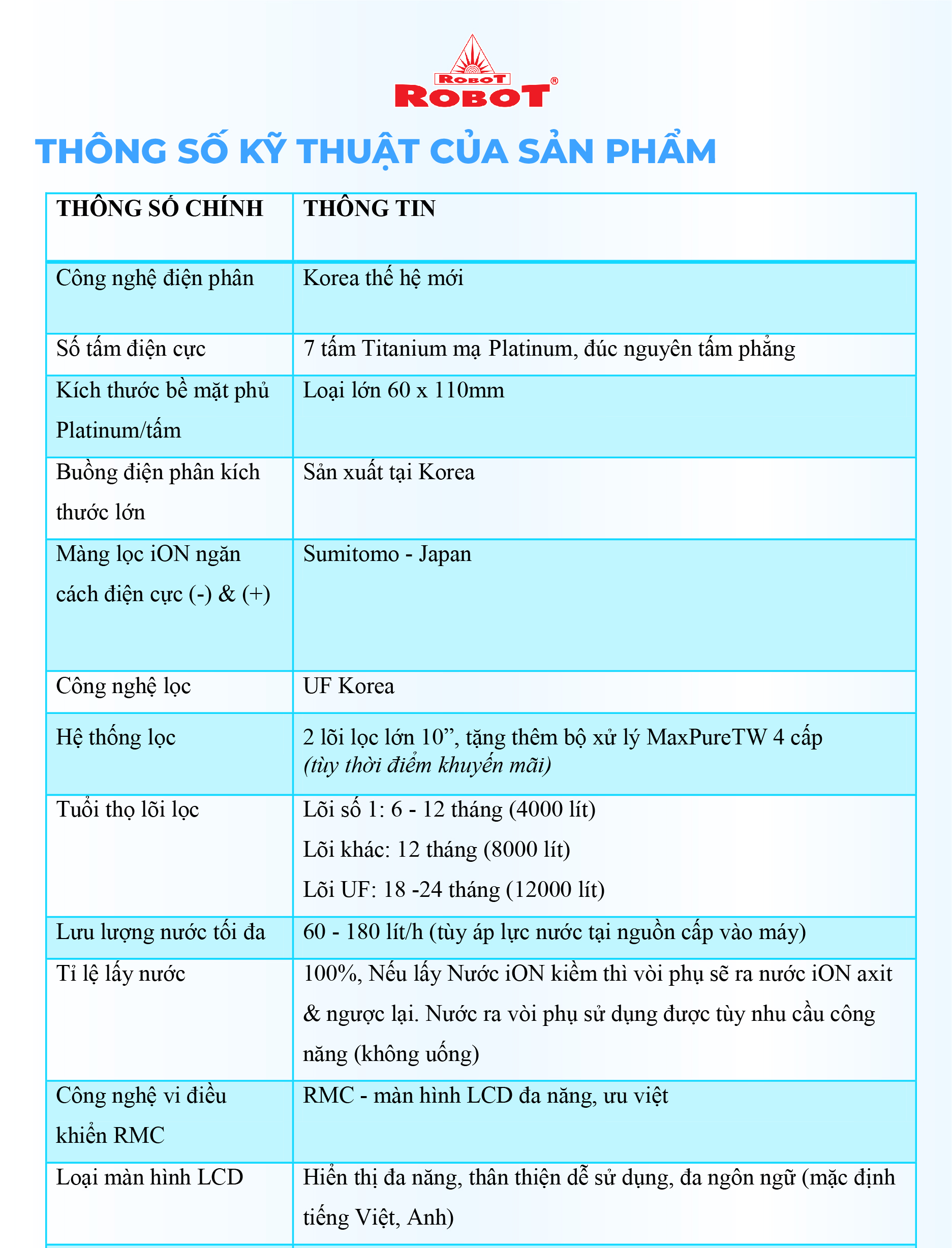 - Và 3 mức nước iON axit (pH 4.5/5.0/5.5). Chất lượng nước đạt chỉ số tối ưu, nồng độ Hydro hoạt tính lên đến ~ 800 -> 950 ppb, chống oxy hóa (ORP) lên đến ~ -400 -> -600 mV, đáp ứng mọi nhu cầu sử dụng trong cuộc sống. Máy lọc nước điện giải iON kiềm Nóng ROBOT ionSmart được thiết kế kiểu dáng hiện đại, thiết kế chinh phục mọi không gian. Đặc biệt, bộ sưu tập 5 sắc màu pastel hiện đại đáp ứng mọi sở thích và phong cách nội thất, chắc chắn sản phẩm sẽ là điểm nhấn đặc sắc trong ngôi nhà của bạn. Chỉ số Hydrogen, ORP của nước tùy thuộc số tấm điện cực, đặc tính nguồn nước & “điều kiện đo trong phòng thí nghiệm chuyên nghiệp, đạt chuẩn”. ️ Máy lọc nước điện giải iON kiềm Nóng ROBOT ionSmart 710, tạo 10 loại nước bổ ích, pH 4.5 --> 10.5 - Đáp ứng mọi nhu cầu trong cuộc sống Có thể tham khảo ý kiến của Bác sĩ hoặc chuyên gia dinh dưỡng để được hướng dẫn loại nước uống phù hợp nhất cho cơ thể. Kiểu dáng hiện đại - Thiết kế chinh phục mọi không gian