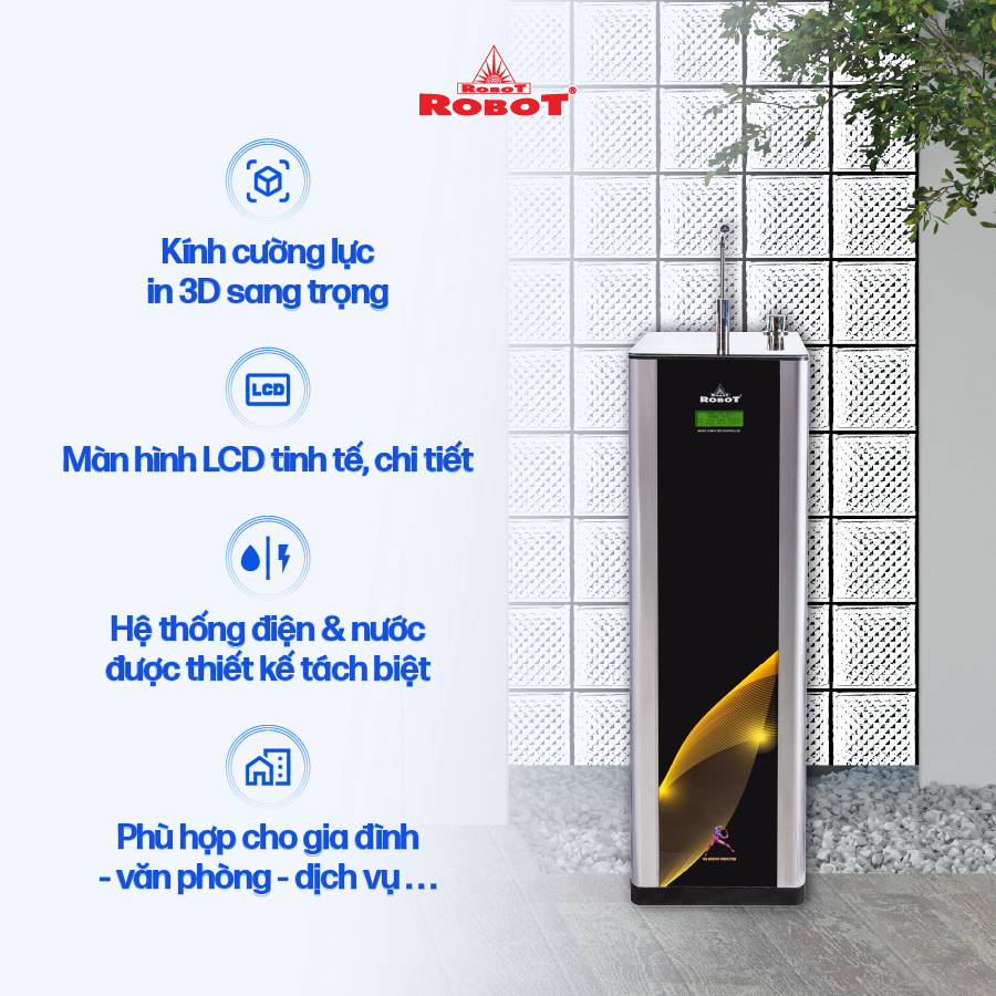 - Kích thước máy nhỏ gọn tối ưu, không chiếm diện tích, phù hợp mọi không gian lắp đặt. Máy lọc nước ROBOT Thế hệ mới có kiểu dáng hiện đại, tinh tế, phù hợp với nhiều không gian và phong cách nội thất khác nhau