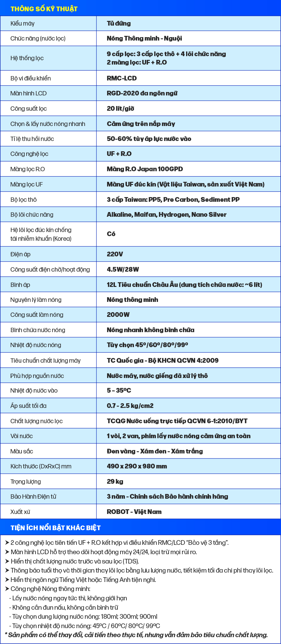 - Cùng các lõi lọc chức năng bù khoáng đặc biệt, cung cấp khoáng chất cần thiết, bổ dưỡng vừa đảm bảo an toàn & vừa tốt cho sức khỏe. Công nghệ RMC – LCD độc quyền, biết được chất lượng nước trước & sau lọc Bộ vi mạch RMC-LCD thông minh thiết kế phát minh của ROBOT, mọi chi tiết vận hành máy được hiển thị trên màn hình LCD, cảnh báo mọi rủi ro cho người sử dụng Tuổi thọ lõi lọc được tính theo lưu lượng nước sử dụng, không tính theo thời gian ghim điện như các máy thông thường, tiết kiệm tối đa chi phí thay lõi lọc
