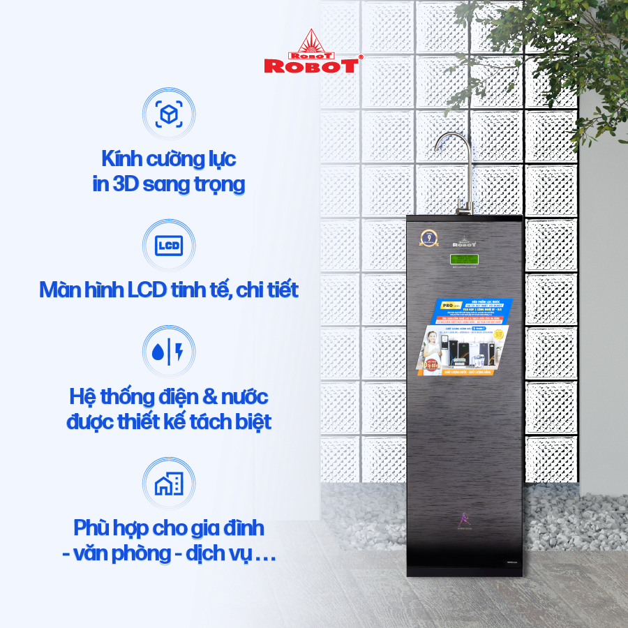 - Kích thước máy nhỏ gọn tối ưu, không chiếm diện tích, phù hợp mọi không gian lắp đặt. Máy lọc nước ROBOT Thế hệ mới có kiểu dáng hiện đại, tinh tế, phù hợp với nhiều không gian và phong cách nội thất khác nhau