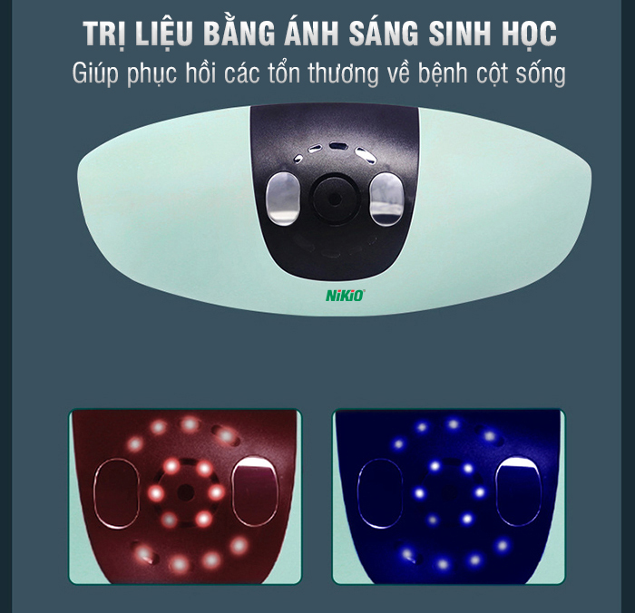 Máy massage thắt lưng chuyên sâu Nikio NK-158 sử dụng ánh sáng sinh học đỏ, xanh, tím để hỗ trợ cải thiện các bệnh lý về cột sống. Ánh sáng sinh học với bước sóng lớn sẽ giúp tái tạo các mô bị tổn thương, gia tăng khả năng phục hồi các bệnh về khớp như: viêm cột sống, thoái hóa cột sống, thoát vị đĩa đệm