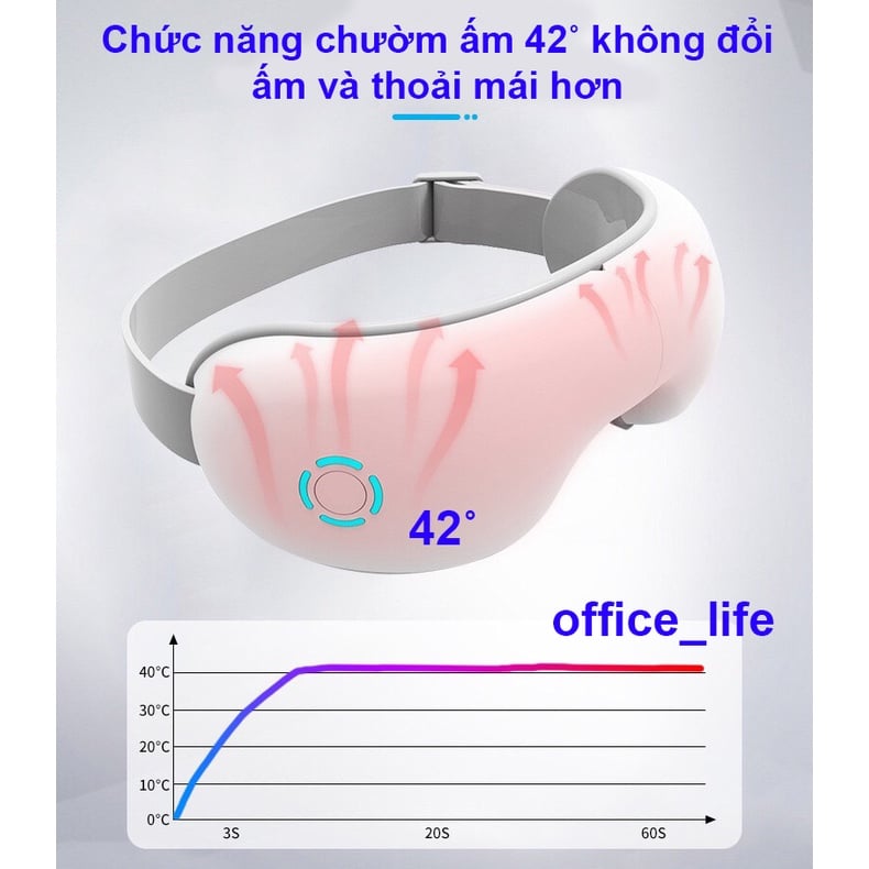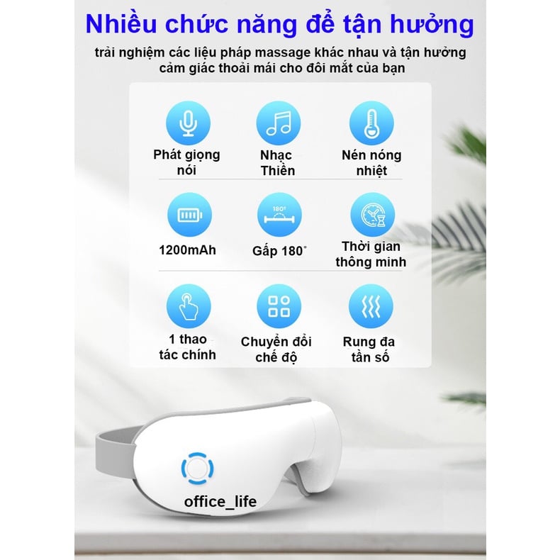 Tính năng của Máy Massage mắt thông minh: - Điều khiển đơn giản với 1 nút ấn - Massage nhiệt giúp lưu thông máu dễ dàng chống thâm mắt, mỏi mắt. - Massage đa tần số (rung) giúp cơ mắt thư giãn tốt. - Massage áp suất giúp mắt đỡ nhức mỏi - Nhạc du dương giúp thư giãn.