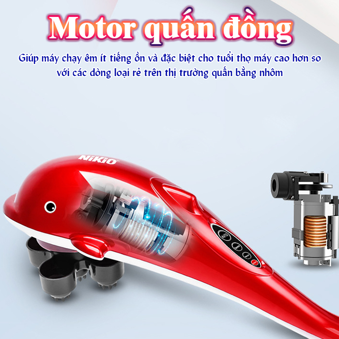Kiểu dáng nhỏ gọn, màu sắc sang trọng đẹp mắt ​​​​​ Ưu điểm của máy mát xa cầm tay cá heo Nikio NK-608B Công nghệ massage rung hiện đại Máy mát xa cầm tay cá heo cầm tay Nikio NK-608B sản xuất theo công nghệ Hàn Quốc, được áp dụng công nghệ massage hiện đại với cơ chế rung khoa học năm 2019. Lực rung của máy tác động nhịp nhàng sâu vào bên trông các mô cơ giúp máu huyết được vận chuyển và lưu thông tốt hơn cả về lượng và chất trong toàn cơ thể. Đặc biệt là vùng cơ nội tạng, giúp bạn giảm tăng huyết áp và giảm đau cơ vai, cổ khi mà bạn ngủ sai tư thế hoặc ngồi làm việc quá lâu. Motor máy quấn bằng đồng nguyên chất Với chất liệu quấn động cơ bằng đồng giúp máy chạy êm ít tiếng ồn và đặc biệt cho tuổi thọ máy cao hơn so với các dòng loại rẻ trên thị trường quấn bằng nhôm. Ngoài ra với dòng Nikio NK-608B này có tính năng chống rung ở dưới phần tay cầm, giúp cho tay khi cầm massage ít làm tê tay. Cho bạn cảm giác thoải mái hơn bao giờ hết. 6 đầu massage chuyên dụng Máy massage cầm tay Nikio NK-608B có 6 đầu massage riêng biệt. Các đầu massage đã được các chuyên gia y tế nghiên cứu rất kỉ dựa trên cơ chế sinh học của cơ thể. Mỗi loại đầu massage sẽ thích hợp với từng vùng trên cơ thể để mang đến hiệu quả massage tốt nhất cho người dùng. Với 6 đầu massage riêng biệt, giúp bạn xoa bóp chính xác vào các huyệt đạo mang đến cảm giác thư giản cho cơ thể, giúp giảm tình trạng căng cơ và đau nhức do vận động nhiều.